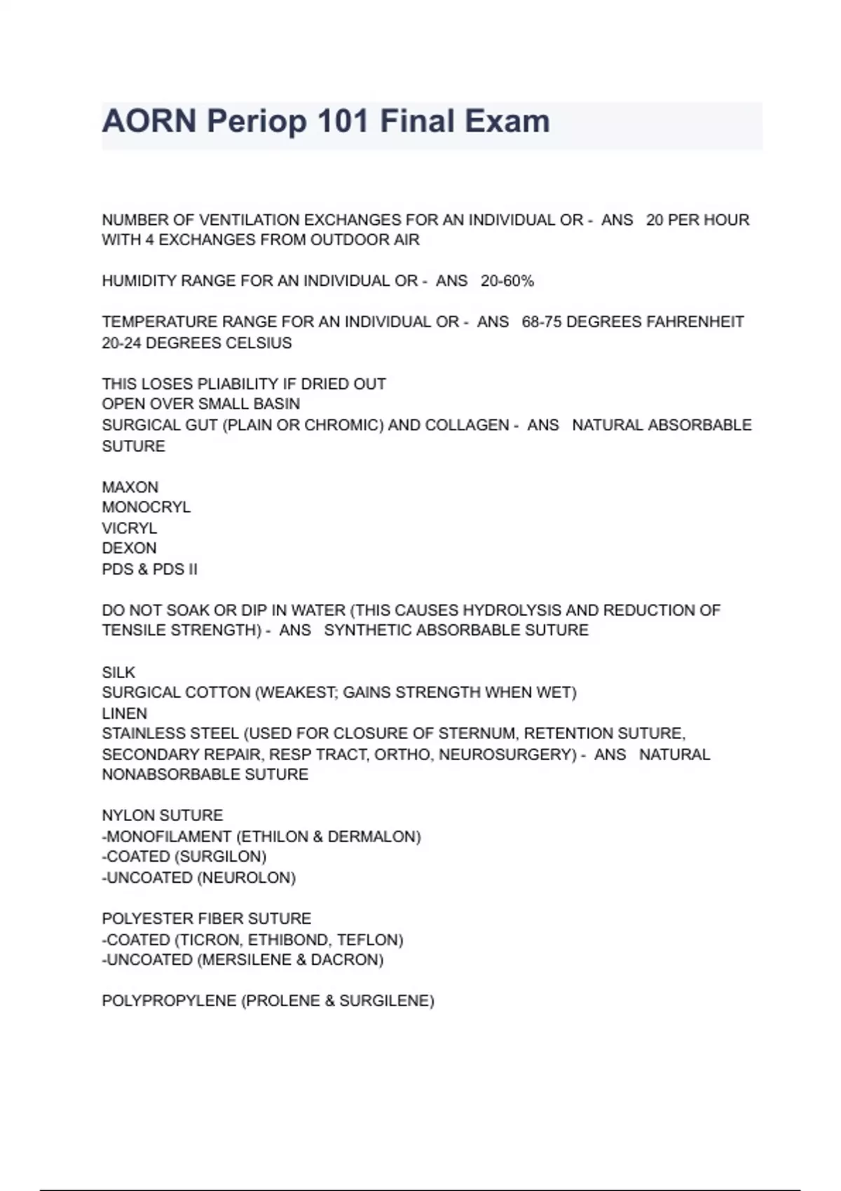 AORN Periop 101 Final Exam Questions With Answers NUMBER OF VENTILATION EXCHANGES FOR AN INDIVIDUAL OR - ANS 20 PER HOUR WITH 4 EXCHANGES FROM OUTDOOR AIR HUMIDITY RANGE FOR AN INDIVIDUAL OR - ANS 20-60% TEMPERATURE RANGE FOR AN INDIVIDUAL OR - ANS 68-75 DEGREES FAHRENHEIT 20-24 DEGREES CELSIUS THIS LOSES PLIABILITY IF DRIED OUT OPEN OVER SMALL BASIN SURGICAL GUT (PLAIN OR CHROMIC) AND COLLAGEN - ANS NATURAL ABSORBABLE SUTURE MAXON MONOCRYL VICRYL DEXON PDS & PDS II DO NOT SOAK OR DIP IN WATER (THIS CAUSES HYDROLYSIS AND REDUCTION OF TENSILE STRENGTH) - ANS SYNTHETIC ABSORBABLE SUTURE SILK SURGICAL COTTON (WEAKEST; GAINS STRENGTH WHEN WET) LINEN STAINLESS STEEL (USED FOR CLOSURE OF STERNUM, RETENTION SUTURE, SECONDARY REPAIR, RESP TRACT, ORTHO, NEUROSURGERY) - ANS NATURAL NONABSORBABLE SUTURE NYLON SUTURE -MONOFILAMENT (ETHILON & DERMALON) -COATED (SURGILON) -UNCOATED (NEUROLON) POLYESTER FIBER SUTURE -COATED (TICRON, ETHIBOND, TEFLON) -UNCOATED (MERSILENE & DACRON) POLYPROPYLENE (PROLENE & SURGILENE) POLYBUTESTER (NOVAFIL) POLYETHYLENE (DERMALENE) - ANS SYNTHETIC NONABSORBABLE SUTURE -NO INFLAMMATION -RESP, ALIMENTARY, AND GU TRACTS NOT ENTERED -EX. EYE SURGERY, HERNIA REPAIRS, BREAST SURGERY, NONTRAUMATIC NEURO & ORTHO SURGERY, CARDIAC, OR PERIPHERAL VASCULAR SURGERY - ANS CLASS I-CLEAN WOUNDS -RESP, ALIMENTARY, OR GU WOUNDS ENTERED UNDER CONTROLLED CONDITIONS AND WITHOUT CONTAMINATION OF SURROUNDING TISSUE -NO EVIDENCE OF INFECTION OR MAJOR BREAK IN ASEPTIC TECHNIQUE -EX. D&C, TOTAL HYSTERECTOMY, GASTRECTOMY, CHOLE WITHOUT SPILLAGE, ELECTIVE APPY, CYSTOSCOPY, TURP ON PT W/ NEGATIVE URINE CULTURES, SIGMOID COLON RESECTION - ANS CLASS II-CLEAN CONTAMINATED -OPEN, FRESH, TRAUMATIC WOUNDS -MAJOR BREAK IN STERILE TECHNIQUE -GROSS SPILLAGE FROM GI TRACT -INCISIONS WITH ACUTE NONPURULENT INFLAMMATION -EX. LAPAROTOMY W/ SIGNIFICANT SPILLAGE, TRAUMATIC WOUNDS, ACUTE APPENDICITIS OR CHOLECYSTITIS, COMPOUND FRACTURES - ANS CLASS III-CONTAMINATED WOUNDS -OLD, TRAUMATIC WOUNDS WITH DEVITALIZED TISSUE, PERFORATED VISCERA, DELAYED PRIMARY WOUND CLOSURE -EX. INCISION AND DRAINAGE, TOTAL EVISCERATION, PERFORATED VISCERA - ANS CLASS IV-DIRTY WOUNDS PURPOSE OF STANDARDIZED NURSING LANGUAGE SUCH AS PNDS - ANS MAINTAIN PT SAFETY, INFECTION CONTROL, AND MANAGEMENT OF SUPPLY COST PLAN OF CARE HELPS TO -PLAN NURSING INTERVENTIONS -ASSESS AND DEVELOP NURSING DIAGNOSES -ASSESS AND EVALUATE PT STATUS -EVALUATE RESPONSES TO POSITIONING REQUIREMENTS OF STORAGE AND MOVEMENT OF DIRTY, CLEAN AND STERILE SUPPLIES WITHIN THE OPERATING ROOM - ANS KEEP COVERED IN ENCLOSED CARTS LABELED, KEEP APART CLEAN, DIRTY AND STERILE ELEMENTS OF PROFESSIONALISM - ANS -GOVERNED BY PRACTICE ACTS THAT OUTLINE LEGAL SCOPE OF PRACTICE -MAINTAIN CURRENT KNOWLEDGE -SEEK OUT COLLEAGUES TO ASSESS THEIR PRACTICE -ACTIVATE PARTICIPANTS IN PROFESSIONAL ORGANIZATIONS -ENGAGE IN ONGOING PROFESSIONAL DEVELOPMENT -MAINTAIN COMPETENCE ACTIVITIES THROUGHOUT CAREER PICO - ANS POPULATION, PATIENT, PROBLEM INTERVENTION COMPARISON OUTCOME 3 MAIN CATEGORIES OF DIRECT COSTS - ANS MEDICAL SUPPLIES PERSONNEL PURCHASING SERVICES IOM REPORT - ANS INSTITUTE OF MEDICINE SAYS THAT NURSES SHOULD PRACTICE TO TE FULL EXTENT OF THEIR EDUCATION AND TRAINING AREAS OF THE STERILE GOWN THAT ARE CONSIDERED STERILE - ANS CHEST, GOWN SLEEVES AT 2 INCHES ABOVE ELBOW TO CUFF CIRCUMFERENTIALLY, CHEST TO LEVEL OF STERILE FIELD WHY IS THERE A RECOMMENDATION TO CHANGE SURGICAL GLOVES AFTER MAX TIME OF 150 MINUTES - ANS PERF