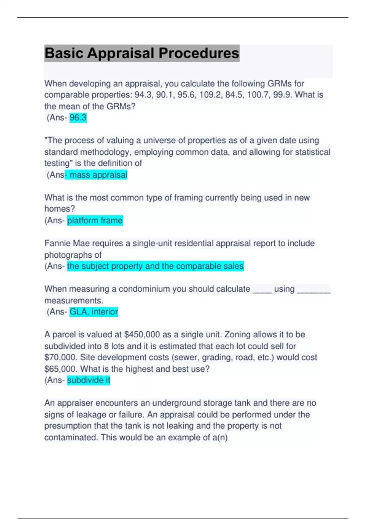 When developing an appraisal, you calculate the following GRMs for comparable properties: 94.3, 90.1, 95.6, 109.2, 84.5, 100.7, 99.9. What is the mean of the GRMs? (Ans- 96.3 "The process of valuing a universe of properties as of a given date using standard methodology, employing common data, and allowing for statistical testing" is the definition of (Ans- mass appraisal What is the most common type of framing currently being used in new homes? (Ans- platform frame Fannie Mae requires a single-unit residential appraisal report to include photographs of (Ans- the subject property and the comparable sales When measuring a condominium you should calculate ____ using _______ measurements. (Ans- GLA, interior A parcel is valued at $450,000 as a single unit. Zoning allows it to be subdivided into 8 lots and it is estimated that each lot could sell for $70,000. Site development costs (sewer, grading, road, etc.) would cost $65,000. What is the highest and best use? (Ans- subdivide it An appraiser encounters an underground storage tank and there are no signs of leakage or failure. An appraisal could be performed under the presumption that the tank is not leaking and the property is not contaminated. This would be an example of a(n) (Ans- extraordinary assumption A deed could provide all of the following information about a property EXCEPT owner of record easements deed restrictions zoning (Ans- zoning You examine a construction contract to build a 2,448 square foot house and the total cost is $197,450. What was the cost per square foot? (Ans- $80.66