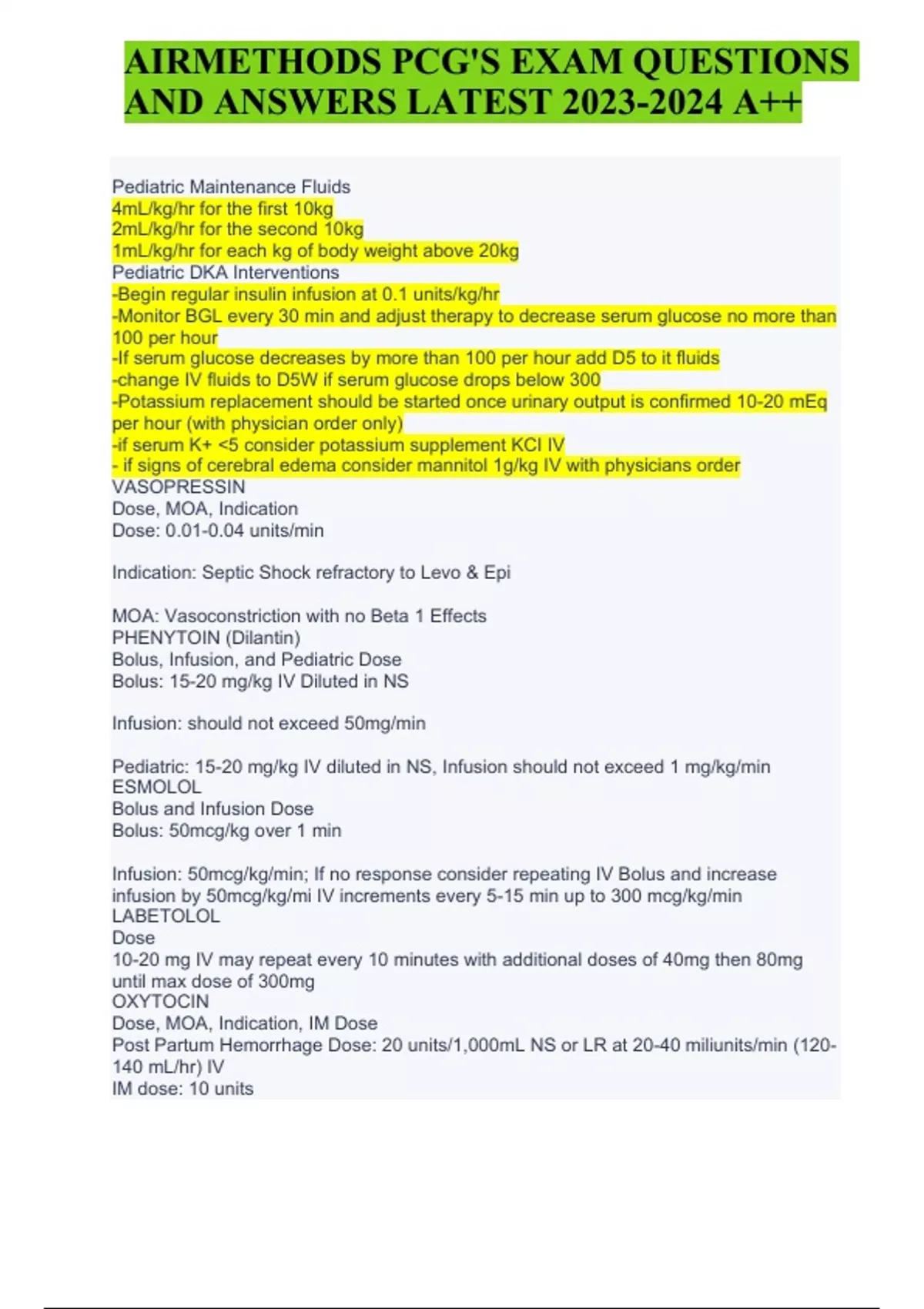 AIRMETHODS PCG'S EXAM QUESTIONS AND ANSWERS LATEST 2024 (GRADED A+) Pediatric Maintenance Fluids 4mL/kg/hr for the first 10kg 2mL/kg/hr for the second 10kg 1mL/kg/hr for each kg of body weight above 20kg Pediatric DKA Interventions -Begin regular insulin infusion at 0.1 units/kg/hr -Monitor BGL every 30 min and adjust therapy to decrease serum glucose no more than 100 per hour -If serum glucose decreases by more than 100 per hour add D5 to it fluids -change IV fluids to D5W if serum glucose drops below 300 -Potassium replacement should be started once urinary output is confirmed 10-20 mEq per hour (with physician order only) -if serum K+ 5 consider potassium supplement KCI IV - if signs of cerebral edema consider mannitol 1g/kg IV with physicians order VASOPRESSIN Dose, MOA, Indication Dose: 0.01-0.04 units/min Indication: Septic Shock refractory to Levo & Epi MOA: Vasoconstriction with no Beta 1 Effects PHENYTOIN (Dilantin) Bolus, Infusion, and Pediatric Dose Bolus: 15-20 mg/kg IV Diluted in NS Infusion: should not exceed 50mg/min Pediatric: 15-20 mg/kg IV diluted in NS, Infusion should not exceed 1 mg/kg/min ESMOLOL Bolus and Infusion Dose Bolus: 50mcg/kg over 1 min Infusion: 50mcg/kg/min; If no response consider repeating IV Bolus and increase infusion by 50mcg/kg/mi IV increments every 5-15 min up to 300 mcg/kg/min LABETOLOL Dose 10-20 mg IV may repeat every 10 minutes with additional doses of 40mg then 80mg until max dose of 300mg
