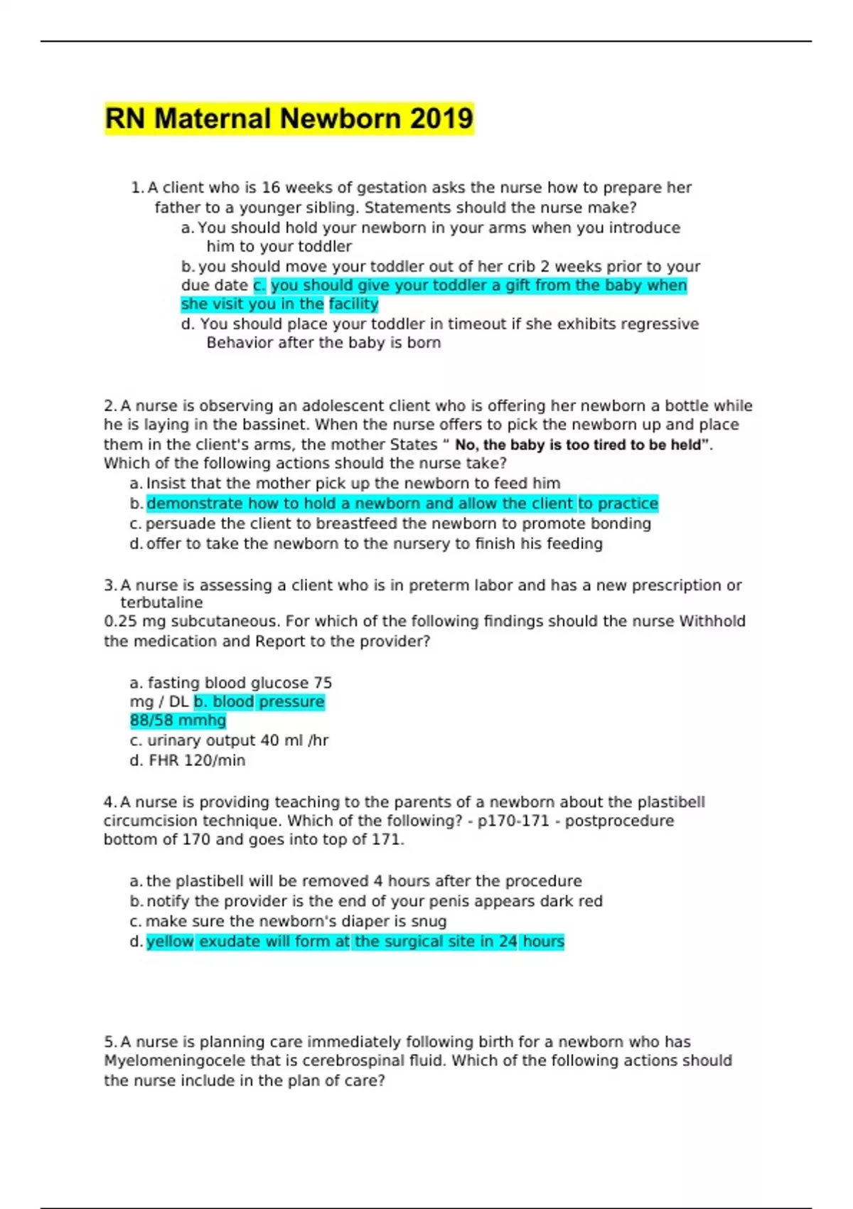 5.A nurse is planning care immediately following birth for a newborn who has Myelomeningocele that is cerebrospinal fluid. Which of the following actions should the nurse include in the plan of care? a.Administer broad-spectrum antibiotics