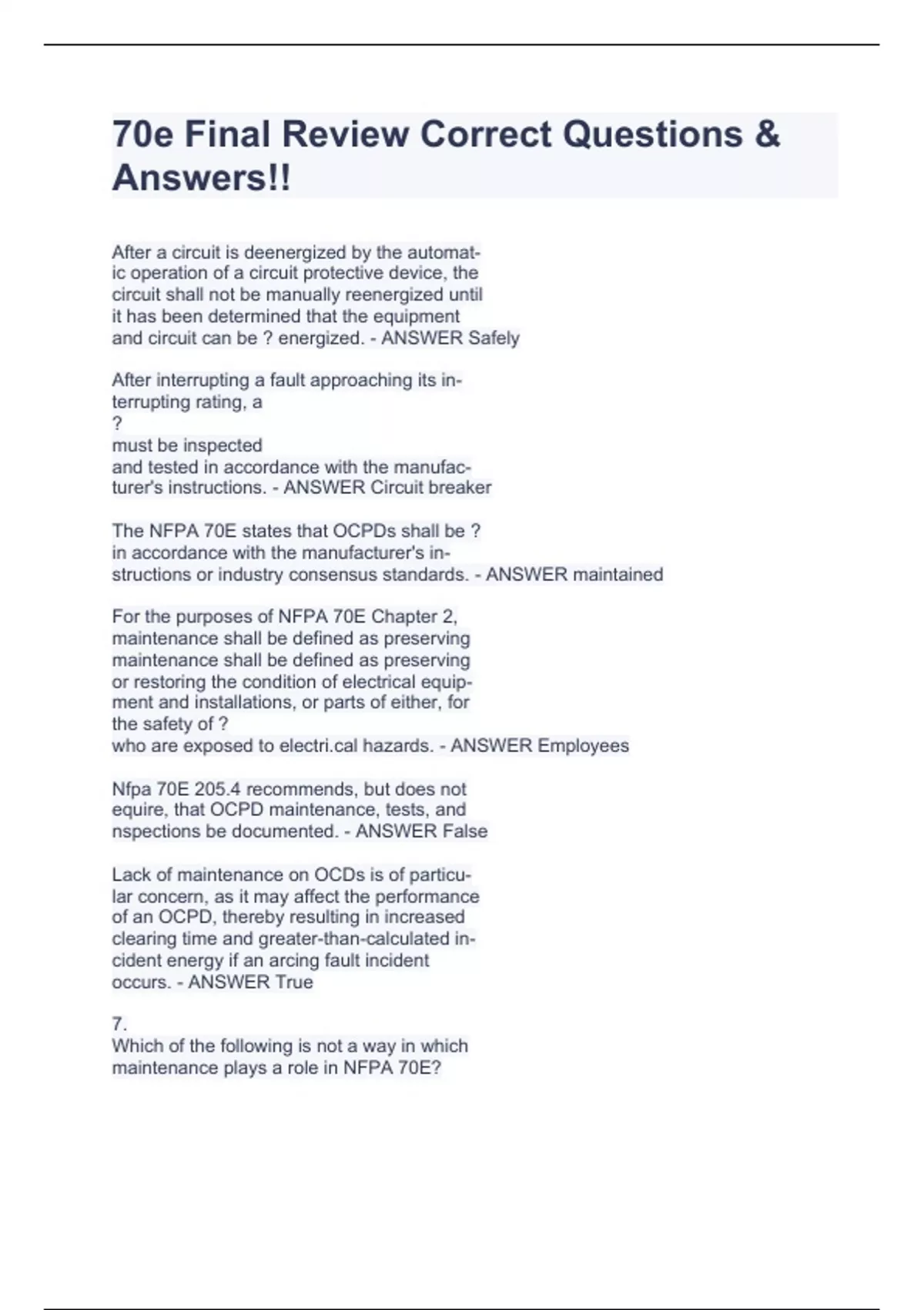 After a circuit is deenergized by the automat- ic operation of a circuit protective device, the circuit shall not be manually reenergized until it has been determined that the equipment and circuit can be ? energized. - ANSWER Safely After interrupting a fault approaching its in- terrupting rating, a ? must be inspected and tested in accordance with the manufac- turer's instructions. - ANSWER Circuit breaker The NFPA 70E states that OCPDs shall be ? in accordance with the manufacturer's in- structions or industry consensus standards. - ANSWER maintained For the purposes of NFPA 70E Chapter 2, maintenance shall be defined as preserving maintenance shall be defined as preserving or restoring the condition of electrical equip- ment and installations, or parts of either, for the safety of ? who are exposed to hazards. - ANSWER Employees Nfpa 70E 205.4 recommends, but does not equire, that OCPD maintenance, tests, and nspections be documented. - ANSWER False