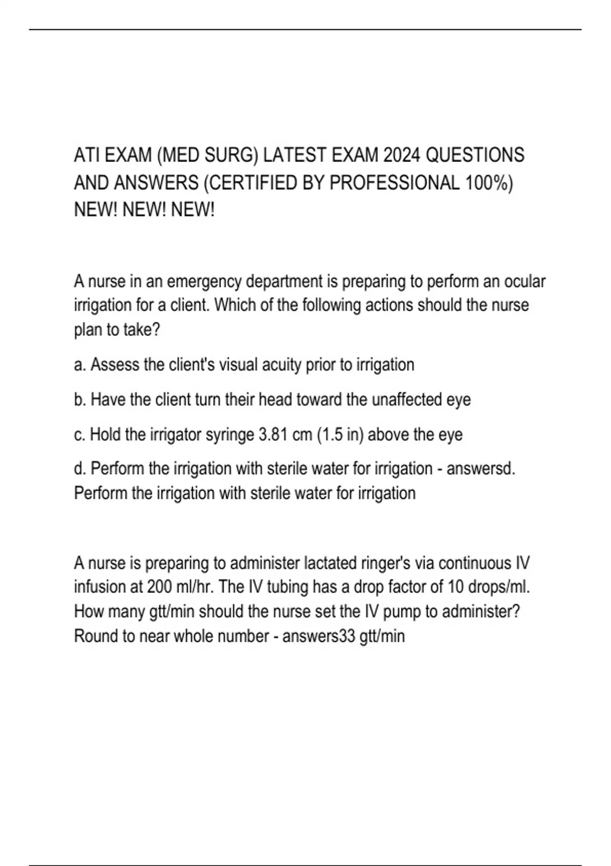 A nurse in an emergency department is preparing to perform an ocular irrigation for a client. Which of the following actions should the nurse plan to take? a. Assess the client's visual acuity prior to irrigation b. Have the client turn their head toward the unaffected eye c. Hold the irrigator syringe 3.81 cm (1.5 in) above the eye d. Perform the irrigation with sterile water for irrigation - answersd. Perform the irrigation with sterile water for irrigation A nurse is preparing to administer lactated ringer's via continuous IV infusion at 200 ml/hr. The IV tubing has a drop factor of 10 drops/ml. How many gtt/min should the nurse set the IV pump to administer? Round to near whole number - answers33 gtt/min A nurse is providing discharge teaching to a client who has a new prescription for sublingual nitroglycerin. Which of the following client statements indicates an understanding of the teaching? a. I can keep my medications for 1 year before replacing it b. I should lie down when I take this medication c. I should discontinue this medication if I develop a headache d. I can take up to five tablets in 15 minutes before seeking medical attention - answersb. I should lie down when I take this medication