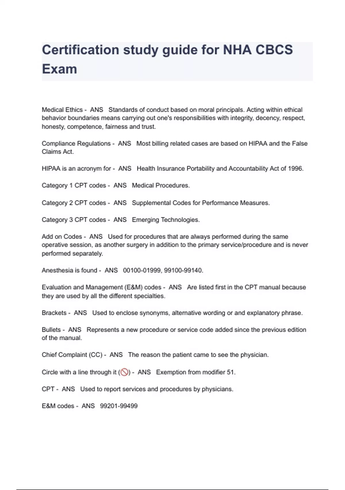 Certification study guide for NHA CBCS Exam Questions And Answers Medical Ethics - ANS Standards of conduct based on moral principals. Acting within ethical behavior boundaries means carrying out one's responsibilities with integrity, decency, respect, honesty, competence, fairness and trust. Compliance Regulations - ANS Most billing related cases are based on HIPAA and the False Claims Act. HIPAA is an acronym for - ANS Health Insurance Portability and Accountability Act of 1996. Category 1 CPT codes - ANS Medical Procedures. Category 2 CPT codes - ANS Supplemental Codes for Performance Measures. Category 3 CPT codes - ANS Emerging Technologies. Add on Codes - ANS Used for procedures that are always performed during the same operative session, as another surgery in addition to the primary service/procedure and is never performed separately. Anesthesia is found - ANS 00100-01999, . Evaluation and Management (E&M) codes - ANS Are listed first in the CPT manual because they are used by all the different specialties. Brackets - ANS Used to enclose synonyms, alternative wording or and explanatory phrase. Bullets - ANS Represents a new procedure or service code added since the previous edition of the manual. Chief Complaint (CC) - ANS The reason the patient came to see the physician. Circle with a line through it () - ANS Exemption from modifier 51. CPT - ANS Used to report services and procedures by physicians. E&M codes - ANS Guidelines are found - ANS At the beginning of each section and used to provide specific coding rules for that section. History (HX) - ANS The set of information the physician gathers from the patient concerning his/her past. History of Present Illness (HPI) - ANS A chronological account of the development of the complaint from the first sign or symptom that the patient experienced to the present. Indented Codes - ANS Listed under associate and stand alone codes. E Codes - ANS For durable medical equipment for use in home. Level 1 codes - ANS Codes found in the CPT manual. Level 2 codes - ANS National codes for the physician and non-physician service not found in the CPT Level 1. Level 3 codes - ANS Used locally or regionally and have been eliminated by the CMS since the implementation of HIPAA. The List of Modifiers is found where in the CPT - ANS Appendix A and in the front of the book. Modifier 50 - ANS Bilateral procedure. Modifier 24 - ANS Attach to E/M service code when service is provided during postoperative period to indicate that the service is not part of postoperative care and not included in the Surgical Package. Modifier 26 - ANS Provider only provided the professional component. Modifier 51 - ANS Used more than one procedure during the same surgical episode. Modifier 57 - ANS Modifier 57 is used on E/M services the day before or day of major surgery when the initial decision to perform the surgery is identified. Modifier 78 - ANS Physician must return to Operating Room to address complication stemming from initial procedure. Modifier 79 - ANS Procedure or service provided during postoperative period not associated with initial procedure. Modifiers - ANS Reporting indicators that indicate that the procedure or service has been altered by specific circumstance but has not changed in it's definition of code. Parentheses - ANS Used to enclose supplementary words, non-essential modifiers. Past, Family and Social History (PFSH) - ANS Consists of patients personal experiences with illnesses, surgeries, and injuries; Information of illnesses predominant in family' Patients educational background, occupation, marital status and other factors. Pathology and Laboratory - ANS . Plus sign indicates () - ANS Add on codes. Radiology - ANS . Review of Symptoms (ROS) - ANS Inventory of the constitutional symptoms regarding the various body systems. Stand Alone Codes - ANS Contain full description to the procedure for a code. Sideways triangle means ( ▶️ ) - ANS Change in wording between triangles. Bullet means - ANS New procedure