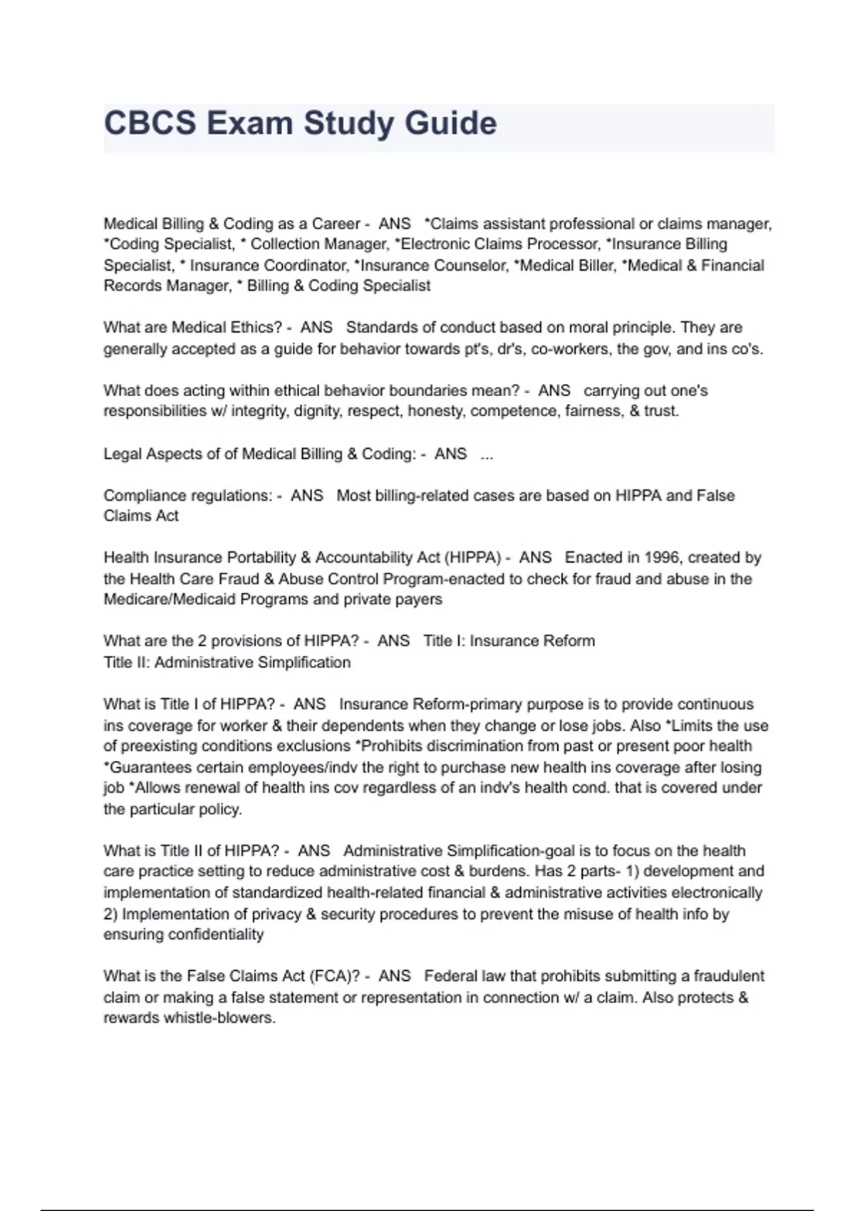 CBCS Exam Study Guide Exam Questions And Answers Medical Billing & Coding as a Career - ANS *Claims assistant professional or claims manager, *Coding Specialist, * Collection Manager, *Electronic Claims Processor, *Insurance Billing Specialist, * Insurance Coordinator, *Insurance Counselor, *Medical Biller, *Medical & Financial Records Manager, * Billing & Coding Specialist What are Medical Ethics? - ANS Standards of conduct based on moral principle. They are generally accepted as a guide for behavior towards pt's, dr's, co-workers, the gov, and ins co's. What does acting within ethical behavior boundaries mean? - ANS carrying out one's responsibilities w/ integrity, dignity, respect, honesty, competence, fairness, & trust. Legal Aspects of of Medical Billing & Coding: - ANS ... Compliance regulations: - ANS Most billing-related cases are based on HIPPA and False Claims Act Health Insurance Portability & Accountability Act (HIPPA) - ANS Enacted in 1996, created by the Health Care Fraud & Abuse Control Program-enacted to check for fraud and abuse in the Medicare/Medicaid Programs and private payers What are the 2 provisions of HIPPA? - ANS Title I: Insurance Reform Title II: Administrative Simplification What is Title I of HIPPA? - ANS Insurance Reform-primary purpose is to provide continuous ins coverage for worker & their dependents when they change or lose jobs. Also *Limits the use of preexisting conditions exclusions *Prohibits discrimination from past or present poor health *Guarantees certain employees/indv the right to purchase new health ins coverage after losing job *Allows renewal of health ins cov regardless of an indv's health cond. that is covered under the particular policy. What is Title II of HIPPA? - ANS Administrative Simplification-goal is to focus on the health care practice setting to reduce administrative cost & burdens. Has 2 parts- 1) development and implementation of standardized health-related financial & administrative activities electronically 2) Implementation of privacy & security procedures to prevent the misuse of health info by ensuring confidentiality What is the False Claims Act (FCA)? - ANS Federal law that prohibits submitting a fraudulent claim or making a false statement or representation in connection w/ a claim. Also protects & rewards whistle-blowers. What is the National Correct Coding Initiative (NCCI)? - ANS Developed by CMS to promote the national correct coding methodologies & to control improper coding that lead to inappropriate payment of Part B health ins claims. How many edits does NCCI include? - ANS 2: 1)Column 1/Column 2 (prev called Comprehensive/Component) Edits 2) Mutually Exclusive Edits Column 1/Column 2 edits (NCCI) - ANS Identifies code pairs that should not be billed together b/c 1 code (Column 1) includes all the services described by another code (Column 2) Mutually Exclusive Edits (NCCI) - ANS ID's code pairs that, for clinical reasons, are unlikely to be performed on the same pt on the same day What are the possible consequences of inaccurate coding and incorrect billing? - ANS *delayed processing & payment of claims *reduced payments, denied claims *fine and/or imprisonment *exclusion from payer's programs, loss of dr's license to practice med Who has the task of investigate and prosecuting health care fraud & abuse? - ANS The Office of Inspector General (OIG) Fraud - ANS knowingly & intentionally deceiving or misrepresenting info that may result in unauthorized benefits. It is a felony and can result in fines and/or prison. Who audits claims? - ANS State & federal agencies as well as private ins co's What are common forms of fraud? - ANS billing for services not furnished, unbundling, & misrepresenting diagnosis to justify payment Abuse - ANS incidences or practices, not usually considered fraudulent, that are inconsistent w/ the accepted medical business or fiscal practices in the industry. What are examples of Abuse? - ANS submitting a claim for services/procedures performed that is not medically necessary, and excessive charges for services, equipment or supplies. What is a method use to minimize danger, hazards, & liabilities associated w/ abuse? - ANS Risk Management Patient Confidentiality - ANS All pt's have right to privacy & all info should remain privileged. Only discuss pt info when necessary to do job. Obtain a signed consent form to release medical info to ins co or other individual. When may providers use PHI (Protected Health Info