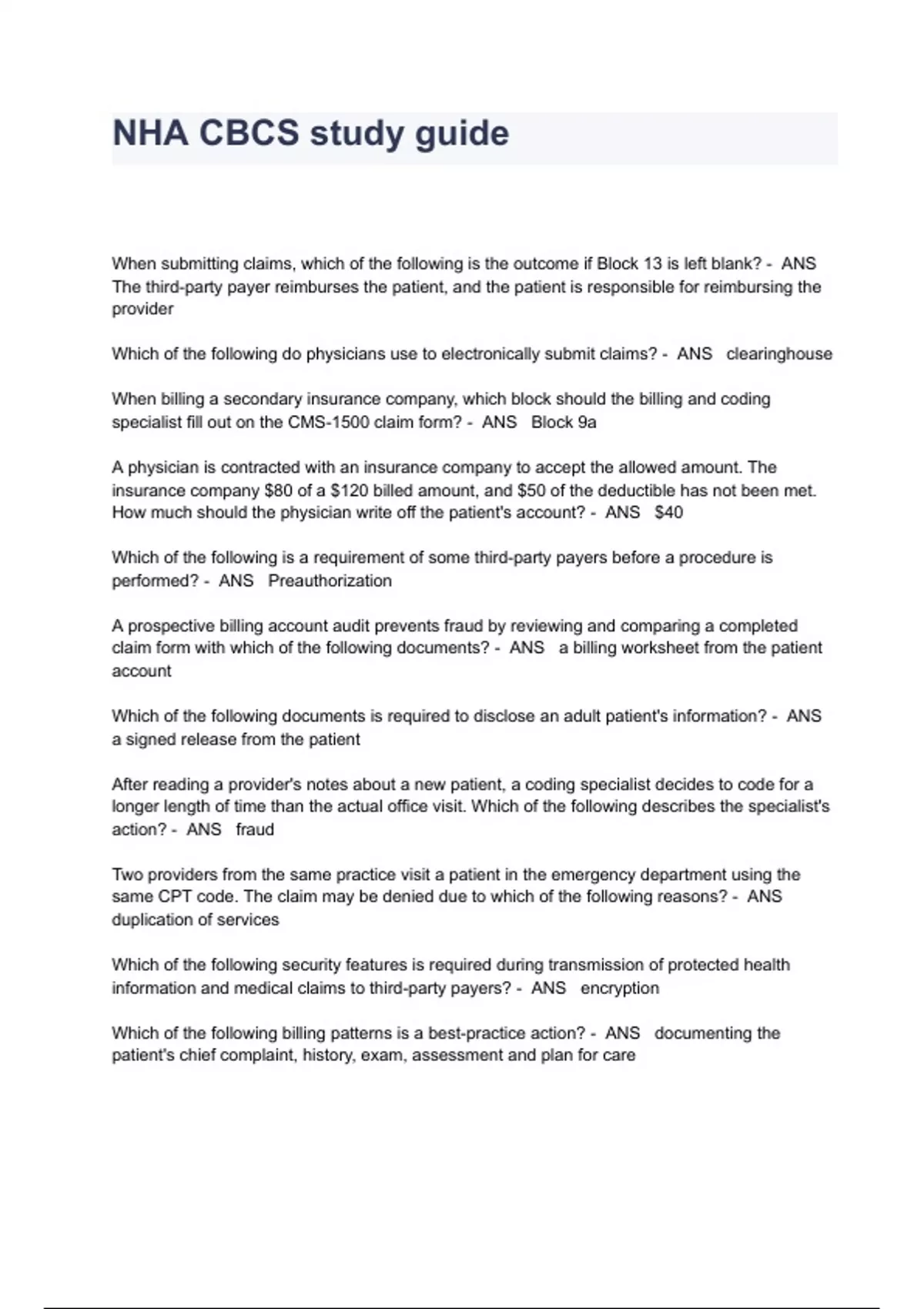 NHA CBCS study guide Questions And Answers When submitting claims, which of the following is the outcome if Block 13 is left blank? - ANS The third-party payer reimburses the patient, and the patient is responsible for reimbursing the provider Which of the following do physicians use to electronically submit claims? - ANS clearinghouse When billing a secondary insurance company, which block should the billing and coding specialist fill out on the CMS-1500 claim form? - ANS Block 9a A physician is contracted with an insurance company to accept the allowed amount. The insurance company $80 of a $120 billed amount, and $50 of the deductible has not been met. How much should the physician write off the patient's account? - ANS $40 Which of the following is a requirement of some third-party payers before a procedure is performed? - ANS Preauthorization A prospective billing account audit prevents fraud by reviewing and comparing a completed claim form with which of the following documents? - ANS a billing worksheet from the patient account Which of the following documents is required to disclose an adult patient's information? - ANS a signed release from the patient After reading a provider's notes about a new patient, a coding specialist decides to code for a longer length of time than the actual office visit. Which of the following describes the specialist's action? - ANS fraud Two providers from the same practice visit a patient in the emergency department using the same CPT code. The claim may be denied due to which of the following reasons? - ANS duplication of services Which of the following security features is required during transmission of protected health information and medical claims to third-party payers? - ANS encryption Which of the following billing patterns is a best-practice action? - ANS documenting the patient's chief complaint, history, exam, assessment and plan for care A provider receives a reimbursement from a third-party payer accompanied by which of the following documents? - ANS explanation of benefits Which of the following is a correct entry of a charge of $150 in Block 24F of the CMS-1500 claim form? - ANS 150 00 A beneficiary of a Medicare/Medicaid crossover claim submitted by a participating provider is responsible for which of the following percentages? - ANS 0% Which of the following coding manuals is used primarily to identify products, supplies, and services? - ANS HCPCS level II manual A billing and coding specialist needs to know how much Medicare paid on a claim before billing the secondary insurance. To which of the following should the specialist refer? - ANS Remittance advice Which of the following is allowed when billing procedural codes? - ANS billing using two-digit CPT modifiers to indicate a procedure as performed differs from its usual five-digit code Which of the following types of health insurance plans best describes a government-sponsored benefit program? - ANS TRICARE Prime Which of the following is the correct term for an amount that has been determined to be uncollectable? - ANS bad debt Which of the following is a type of claim that will be denied by the third-party payers? - ANS incomplete claim If a patient has osteomyelitis, he has problems with which of the following areas? - ANS bones and bone marrow Block 17b on the CMS-1500 claim form should list which of the following information? - ANS referring physician's national provider identifier (NPI) number Which of the following actions should the billing and coding specialist take to effectively manage accounts receivable? - ANS collect copayment from the patient at the time of service Which of the following acts applies to the Administrative Simplification guidelines? - ANS Health Insurance Portability and Accountability Act (HIPAA)