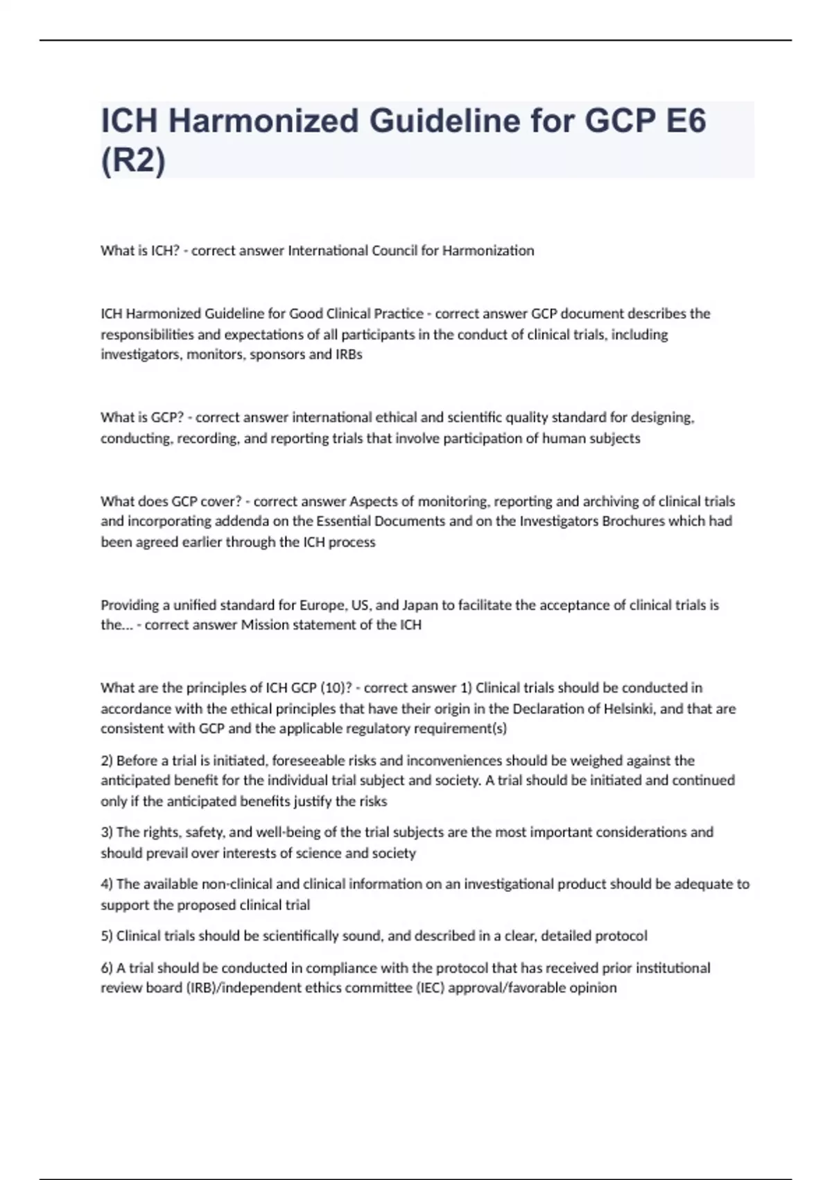 ICH Harmonized Guideline for GCP E6 (R2) What is ICH? - correct answer International Council for Harmonization ICH Harmonized Guideline for Good Clinical Practice - correct answer GCP document describes the responsibilities and expectations of all participants in the conduct of clinical trials, including investigators, monitors, sponsors and IRBs What is GCP? - correct answer international ethical and scientific quality standard for designing, conducting, recording, and reporting trials that involve participation of human subjects What does GCP cover? - correct answer Aspects of monitoring, reporting and archiving of clinical trials and incorporating addenda on the Essential Documents and on the Investigators Brochures which had been agreed earlier through the ICH process Providing a unified standard for Europe, US, and Japan to facilitate the acceptance of clinical trials is the... - correct answer Mission statement of the ICH What are the principles of ICH GCP (10)? - correct answer 1) Clinical trials should be conducted in accordance with the ethical principles that have their origin in the Declaration of Helsinki, and that are consistent with GCP and the applicable regulatory requirement(s) 2) Before a trial is initiated, foreseeable risks and inconveniences should be weighed against the anticipated benefit for the individual trial subject and society. A trial should be initiated and continued only if the anticipated benefits justify the risks 3) The rights, safety, and well-being of the trial subjects are the most important considerations and should prevail over interests of science and society 4) The available non-clinical and clinical information on an investigational product should be adequate to support the proposed clinical trial 5) Clinical trials should be scientifically sound, and described in a clear, detailed protocol 6) A trial should be conducted in compliance with the protocol that has received prior institutional review board (IRB)/independent ethics committee (IEC) approval/favorable opinion