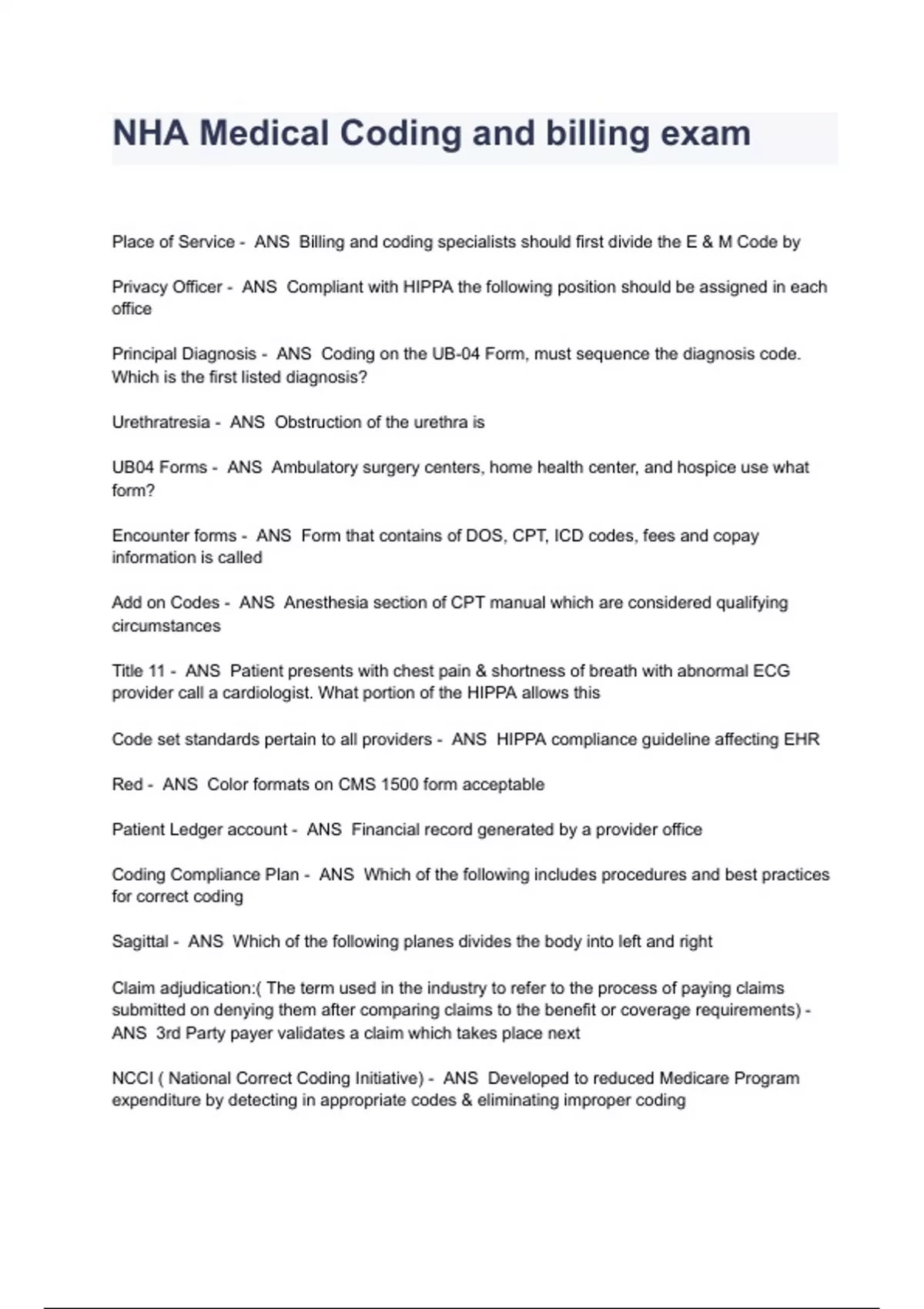 NHA Medical Coding and billing exam Questions With Solutions Place of Service - ANS Billing and coding specialists should first divide the E & M Code by Privacy Officer - ANS Compliant with HIPPA the following position should be assigned in each office Principal Diagnosis - ANS Coding on the UB-04 Form, must sequence the diagnosis code. Which is the first listed diagnosis? Urethratresia - ANS Obstruction of the urethra is UB04 Forms - ANS Ambulatory surgery centers, home health center, and hospice use what form? Encounter forms - ANS Form that contains of DOS, CPT, ICD codes, fees and copay information is called Add on Codes - ANS Anesthesia section of CPT manual which are considered qualifying circumstances Title 11 - ANS Patient presents with chest pain & shortness of breath with abnormal ECG provider call a cardiologist. What portion of the HIPPA allows this Code set standards pertain to all providers - ANS HIPPA compliance guideline affecting EHR Red - ANS Color formats on CMS 1500 form acceptable Patient Ledger account - ANS Financial record generated by a provider office Coding Compliance Plan - ANS Which of the following includes procedures and best practices for correct coding Sagittal - ANS Which of the following planes divides the body into left and right Claim adjudication:( The term used in the industry to refer to the process of paying claims submitted on denying them after comparing claims to the benefit or coverage requirements) - ANS 3rd Party payer validates a claim which takes place next NCCI ( National Correct Coding Initiative) - ANS Developed to reduced Medicare Program expenditure by detecting in appropriate codes & eliminating improper coding 0% - ANS Beneficiary of Medicaid/ Medicare crossover claim is responsible for the percentage Internal monitoring and auditing - ANS Which of the following steps would be part of a physicians practice compliance program HIPPA - ANS Which of the following acts applies to the administrative simplification guidelines? Accounts recievable - ANS Patient charges that have not been paid will appear in which of the following adjudication - ANS Which of the following is considered the final determination of the issues involving settlement of an insurance claim A billing worksheet from the patient account - ANS A prospective billing account audit prevents fraud by reviewing & comparing a completed claim for with which of the following documents Lymphatic system - ANS Which of the following parts of the body system regulates immunity Billing using 2- digit CPT Modifiers to indicate a procedure as preformed differs from its usual 5 digit code - ANS Which of the following is allowed when billing procedural codes Direct Data entry - ANS A biller will electronically submit a claim to the carrier via which of the following? A Providers office with fewer than 10 fulltime employees - ANS Medicare enforces mandatory submission of electronic claims for most providers. Which of the providers is allowed to submit paper claims to Medicare? (RAC) Recovery audit Contractor - ANS Which of the following organizations identifies improper payments made on CMS claims Bone and bone marrow - ANS IF a patient has osteomyelitis he has problems with which of the following areas? Preauthorization form - ANS Which of the following is a requirement of some third-party payers before a procedure is performed? Precertification - ANS Ensure appropriate insurance coverage for an outpatient procedure by first using the following process History - ANS Key component if an evaluation and management service 837 - ANS Format used to submit electronic claims and 3rd Party payer Office of the Inspector General (OIG) - ANS Entity that defines the essential element of a comprehensive compliance program National Coverage Determination - ANS Medicare Policy determines if a particular item or service is covered Left upper quadrant - ANS Location of the stomach, spleen, part of the pancreas and liver 18% - ANS Coding a front torso burn, what % should be used? An italicized code used as the 1st listed diagnosis - ANS Result of a claim being denied Charging excessive fees - ANS Example of