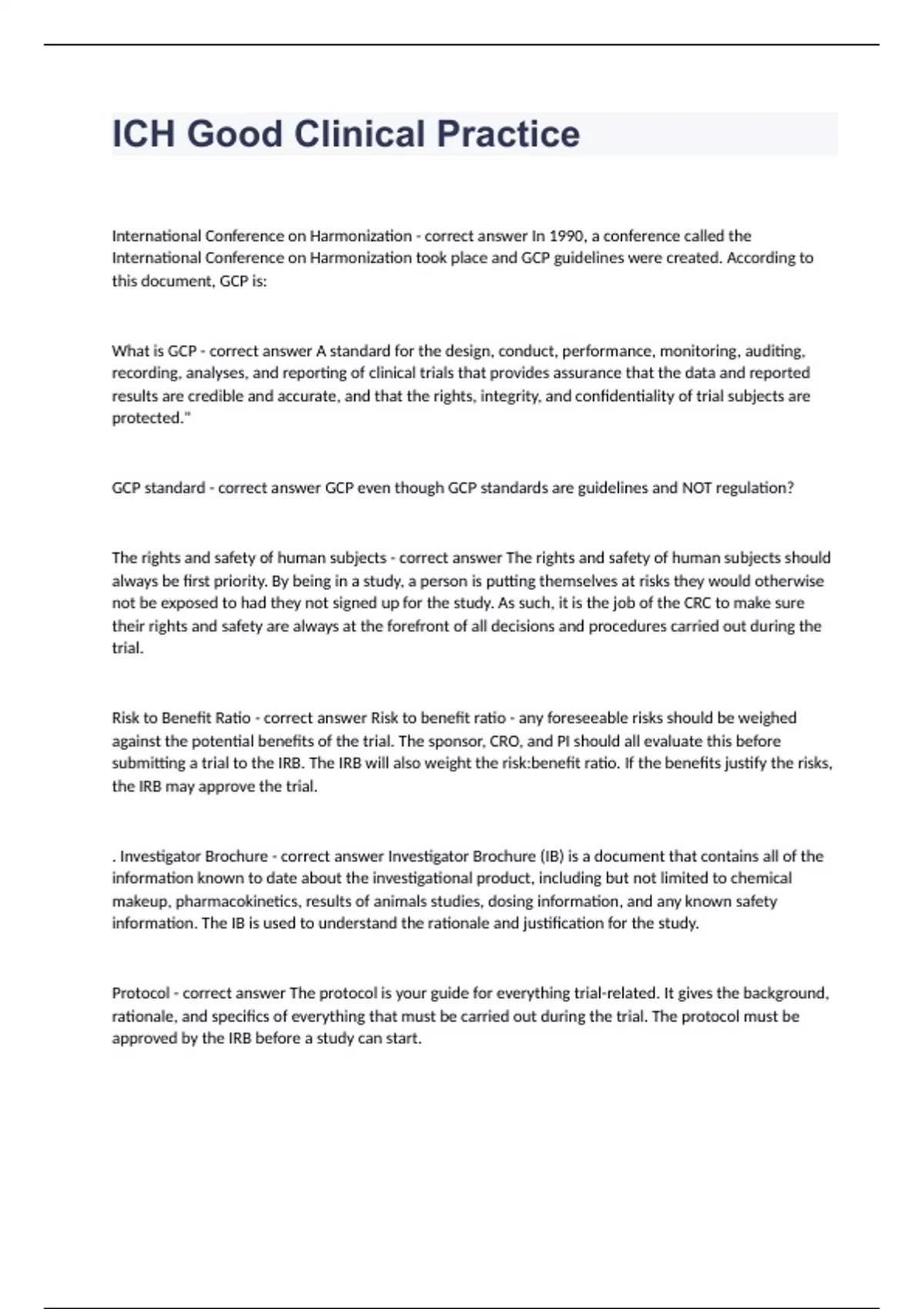 ICH Good Clinical Practice International Conference on Harmonization - correct answer In 1990, a conference called the International Conference on Harmonization took place and GCP guidelines were created. According to this document, GCP is: What is GCP - correct answer A standard for the design, conduct, performance, monitoring, auditing, recording, analyses, and reporting of clinical trials that provides assurance that the data and reported results are credible and accurate, and that the rights, integrity, and confidentiality of trial subjects are protected." GCP standard - correct answer GCP even though GCP standards are guidelines and NOT regulation? The rights and safety of human subjects - correct answer The rights and safety of human subjects should always be first priority. By being in a study, a person is putting themselves at risks they would otherwise not be exposed to had they not signed up for the study. As such, it is the job of the CRC to make sure their rights and safety are always at the forefront of all decisions and procedures carried out during the trial. Risk to Benefit Ratio - correct answer Risk to benefit ratio - any foreseeable risks should be weighed against the potential benefits of the trial. The sponsor, CRO, and PI should all evaluate this before submitting a trial to the IRB. The IRB will also weight the risk:benefit ratio. If the benefits justify the risks, the IRB may approve the trial. . Investigator Brochure - correct answer Investigator Brochure (IB) is a document that contains all of the information known to date about the investigational product, including but not limited to chemical makeup, pharmacokinetics, results of animals studies, dosing information, and any known safety information. The IB is used to understand the rationale and justification for the study. Protocol - correct answer The protocol is your guide for everything trial-related. It gives the background, rationale, and specifics of everything that must be carried out during the trial. The protocol must be approved by the IRB before a study can start.