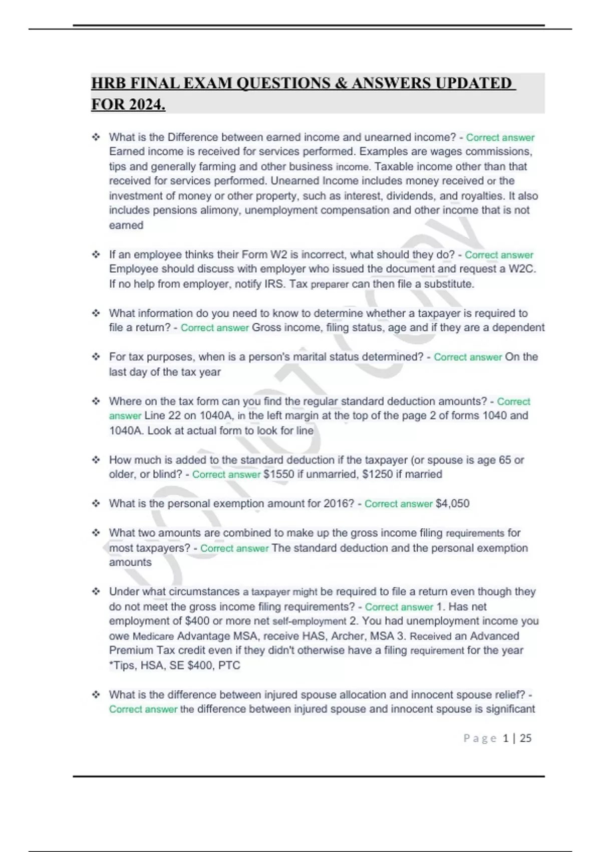 HRB FINAL EXAM QUESTIONS & ANSWERS UPDATED FOR 2024..HRB FINAL EXAM QUESTIONS & ANSWERS UPDATED FOR 2024..
