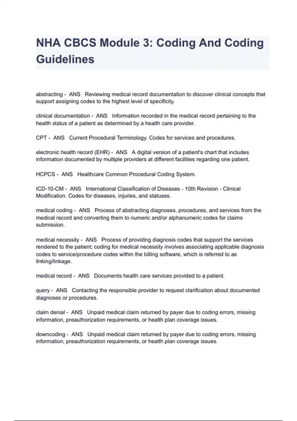 NHA CBCS Module 3: Coding And Coding Guidelines Exam Questions And Answers abstracting - ANS Reviewing medical record documentation to discover clinical concepts that support assigning codes to the highest level of specificity. clinical documentation - ANS Information recorded in the medical record pertaining to the health status of a patient as determined by a health care provider. CPT - ANS Current Procedural Terminology. Codes for services and procedures. electronic health record (EHR) - ANS A digital version of a patient's chart that includes information documented by multiple providers at different facilities regarding one patient. HCPCS - ANS Healthcare Common Procedural Coding System. ICD-10-CM - ANS International Classification of Diseases - 10th Revision - Clinical Modification. Codes for diseases, injuries, and statuses. medical coding - ANS Process of abstracting diagnoses, procedures, and services from the medical record and converting them to numeric and/or alphanumeric codes for claims submission. medical necessity - ANS Process of providing diagnosis codes that support the services rendered to the patient; coding for medical necessity involves associating applicable diagnosis codes to service/procedure codes within the billing software, which is referred to as linking/linkage. medical record - ANS Documents health care services provided to a patient. query - ANS Contacting the responsible provider to request clarification about documented diagnoses or procedures. claim denial - ANS Unpaid medical claim returned by payer due to coding errors, missing information, preauthorization requirements, or health plan coverage issues. downcoding - ANS Unpaid medical claim returned by payer due to coding errors, missing information, preauthorization requirements, or health plan coverage issues. encounter form - ANS Financial record source document used by providers to record treated diagnoses and services provided to a patient for a single encounter. modifier - ANS Provides additional information about a procedure or service without altering the definition of the code description. preauthorization - ANS Prior approval for services granted by payer after health plan review. History of Present Illness (HPI) - ANS Brief description of the patient's present illness or other reason for an encounter, including such details as locations, duration, severity, and associated signs and symptoms. unbundling - ANS Submitting multiple CPT codes when a single code is available to report services in full. upcoding - ANS Assignment of ICD-10-CM code that is more severe than diagnosis supported by the documentation in the medical record. Every patient encounter must include _________________. - ANS Every patient encounter must include the reason for the encounter and supported medical necessity. Documentation for each encounter includes the reason for the encounter, history, physical exam, diagnostic or laboratory tests, and a treatment plan to support each CPT, ICD-10-CM, or HCPCS code reported on the claim. What does SOAP stand for and what is it used for? - ANS Subjective, Objective, Assessment, Plan Used to abstract information and details required for code assignments. Explain the "S" in SOAP. - ANS Subjective - symptoms or history of the condition using the patient's own words, described improvement or decline of the condition since the last treatment, explanations for any gaps in treatments, and the patient's compliance with provider recommendations. Explain the "O" in SOAP. - ANS Objective - vital signs, physical examination findings, laboratory and other diagnostic data, and imaging results and documentation from other clinicians that have been reviewed and considered. Explain the "A" in SOAP. - ANS Assessment - the diagnostic impression or working diagnoses based on the subjective complaints and objective findings.
