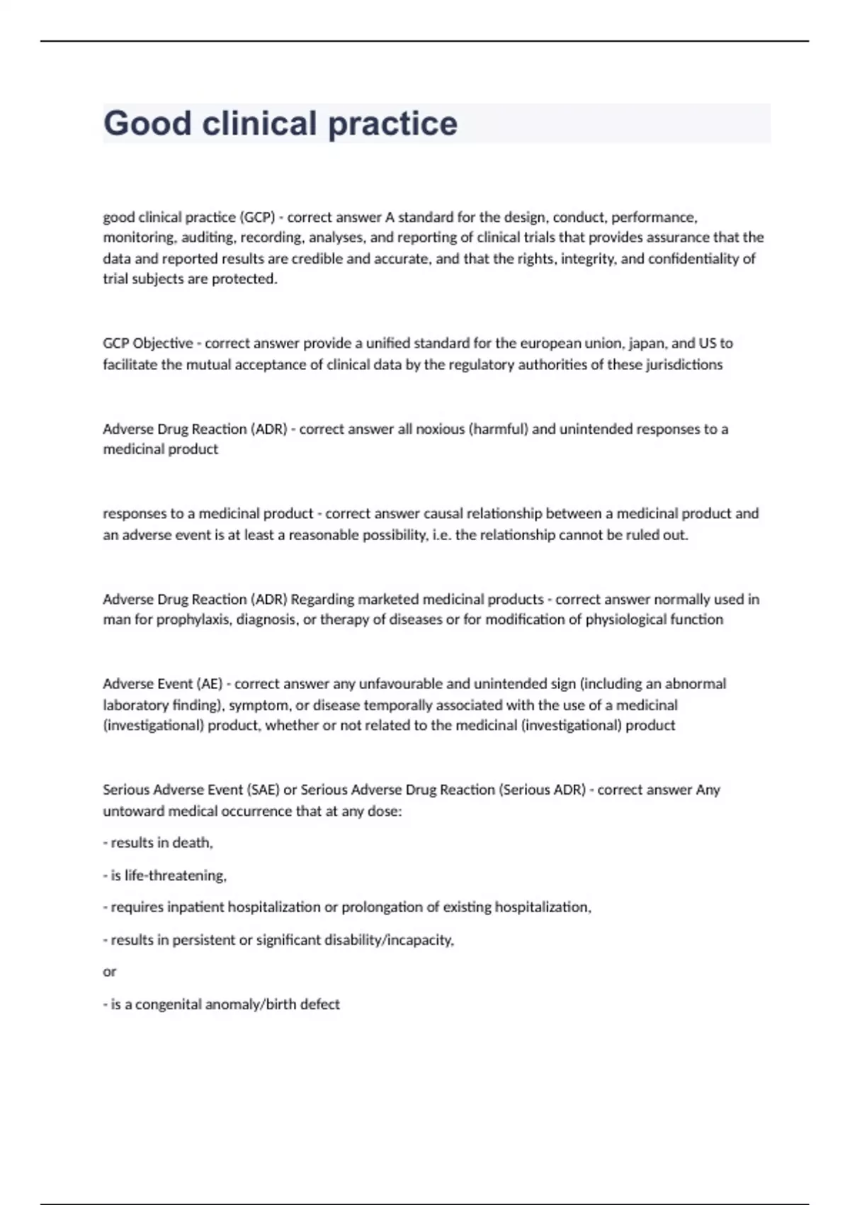 Good clinical practice good clinical practice (GCP) - correct answer A standard for the design, conduct, performance, monitoring, auditing, recording, analyses, and reporting of clinical trials that provides assurance that the data and reported results are credible and accurate, and that the rights, integrity, and confidentiality of trial subjects are protected. GCP Objective - correct answer provide a unified standard for the european union, japan, and US to facilitate the mutual acceptance of clinical data by the regulatory authorities of these jurisdictions Adverse Drug Reaction (ADR) - correct answer all noxious (harmful) and unintended responses to a medicinal product responses to a medicinal product - correct answer causal relationship between a medicinal product and an adverse event is at least a reasonable possibility, i.e. the relationship cannot be ruled out. Adverse Drug Reaction (ADR) Regarding marketed medicinal products - correct answer normally used in man for prophylaxis, diagnosis, or therapy of diseases or for modification of physiological function Adverse Event (AE) - correct answer any unfavourable and unintended sign (including an abnormal laboratory finding), symptom, or disease temporally associated with the use of a medicinal (investigational) product, whether or not related to the medicinal (investigational) product Serious Adverse Event (SAE) or Serious Adverse Drug Reaction (Serious ADR) - correct answer Any untoward medical occurrence that at any dose: - results in death, - is life-threatening, - requires inpatient hospitalization or prolongation of existing hospitalization, - results in persistent or significant disability/incapacity, or - is a congenital anomaly/birth defect