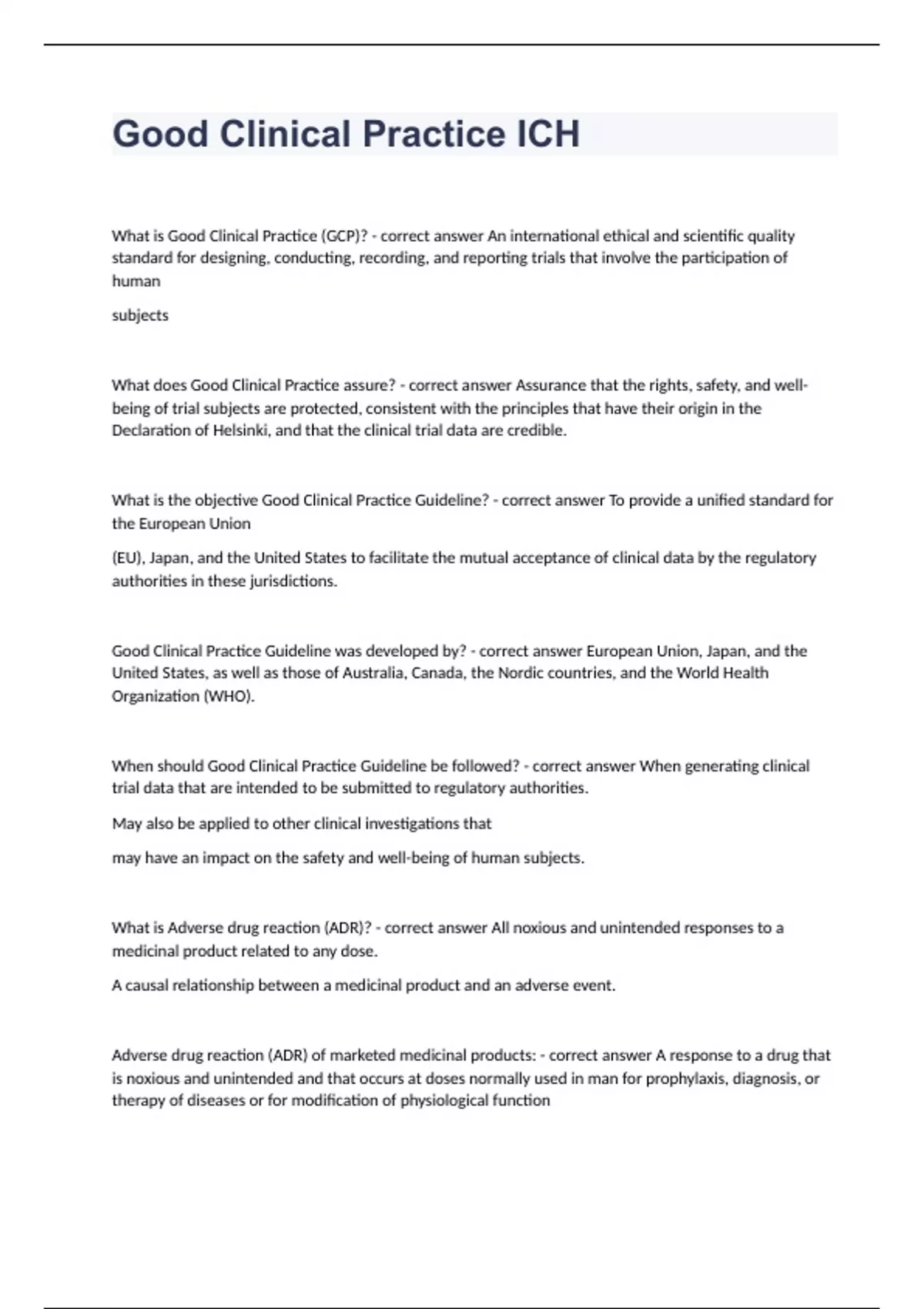 Good Clinical Practice ICH What is Good Clinical Practice (GCP)? - correct answer An international ethical and scientific quality standard for designing, conducting, recording, and reporting trials that involve the participation of human subjects What does Good Clinical Practice assure? - correct answer Assurance that the rights, safety, and well-being of trial subjects are protected, consistent with the principles that have their origin in the Declaration of Helsinki, and that the clinical trial data are credible. What is the objective Good Clinical Practice Guideline? - correct answer To provide a unified standard for the European Union (EU), Japan, and the United States to facilitate the mutual acceptance of clinical data by the regulatory authorities in these jurisdictions. Good Clinical Practice Guideline was developed by? - correct answer European Union, Japan, and the United States, as well as those of Australia, Canada, the Nordic countries, and the World Health Organization (WHO). When should Good Clinical Practice Guideline be followed? - correct answer When generating clinical trial data that are intended to be submitted to regulatory authorities. May also be applied to other clinical investigations that may have an impact on the safety and well-being of human subjects. What is Adverse drug reaction (ADR)? - correct answer All noxious and unintended responses to a medicinal product related to any dose. A causal relationship between a medicinal product and an adverse event. Adverse drug reaction (ADR) of marketed medicinal products: - correct answer A response to a drug that is noxious and unintended and that occurs at doses normally used in man for prophylaxis, diagnosis, or therapy of diseases or for modification of physiological function