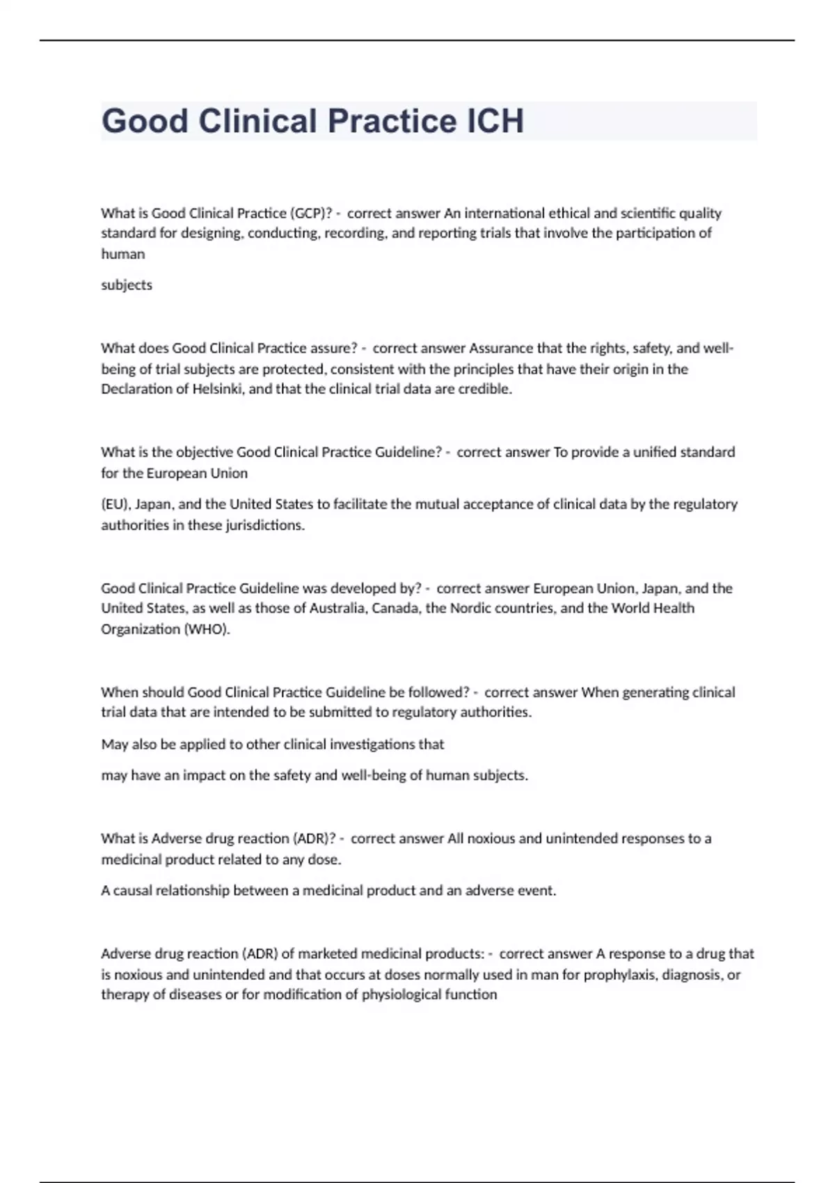 Good Clinical Practice ICHWhat is Good Clinical Practice (GCP)? - correct answer An international ethical and scientific quality standard for designing, conducting, recording, and reporting trials that involve the participation of human subjects What does Good Clinical Practice assure? - correct answer Assurance that the rights, safety, and well-being of trial subjects are protected, consistent with the principles that have their origin in the Declaration of Helsinki, and that the clinical trial data are credible. What is the objective Good Clinical Practice Guideline? - correct answer To provide a unified standard for the European Union (EU), Japan, and the United States to facilitate the mutual acceptance of clinical data by the regulatory authorities in these jurisdictions. Good Clinical Practice Guideline was developed by? - correct answer European Union, Japan, and the United States, as well as those of Australia, Canada, the Nordic countries, and the World Health Organization (WHO). When should Good Clinical Practice Guideline be followed? - correct answer When generating clinical trial data that are intended to be submitted to regulatory authorities. May also be applied to other clinical investigations that may have an impact on the safety and well-being of human subjects. What is Adverse drug reaction (ADR)? - correct answer All noxious and unintended responses to a medicinal product related to any dose. A causal relationship between a medicinal product and an adverse event. Adverse drug reaction (ADR) of marketed medicinal products: - correct answer A response to a drug that is noxious and unintended and that occurs at doses normally used in man for prophylaxis, diagnosis, or therapy of diseases or for modification of physiological function