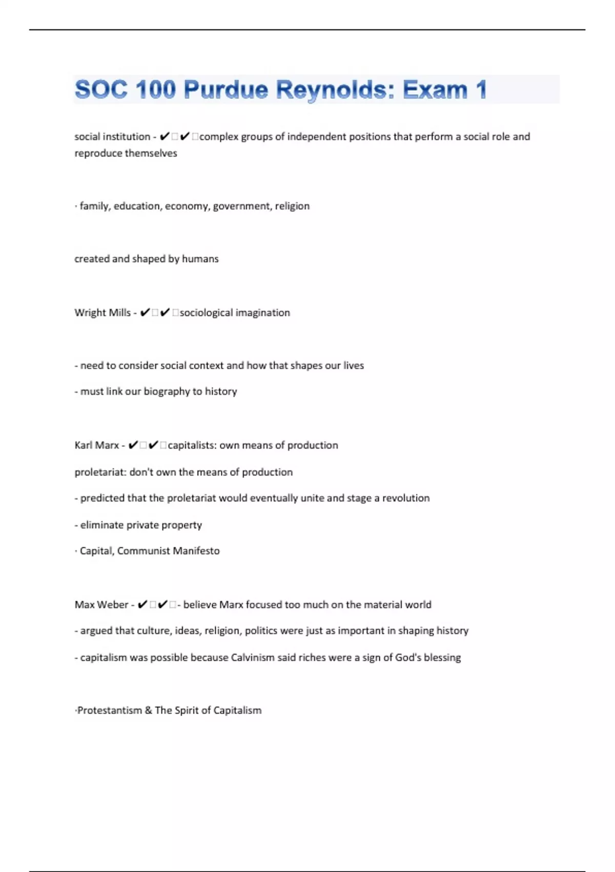 social institution - ️️complex groups of independent positions that perform a social role and reproduce themselves ∙ family, education, economy, government, religion created and shaped by humans Wright Mills - ️️sociological imagination - need to consider social context and how that shapes our lives - must link our biography to history Karl Marx - ️️capitalists: own means of production proletariat: don't own the means of production - predicted that the proletariat would eventually unite and stage a revolution - eliminate private property ∙ Capital, Communist Manifesto Max Weber - ️️- believe Marx focused too much on the material world - argued that culture, ideas, religion, politics were just as important in shaping history - capitalism was possible because Calvinism said riches were a sign of God's blessing ∙Protestantism & The Spirit of Capitalism