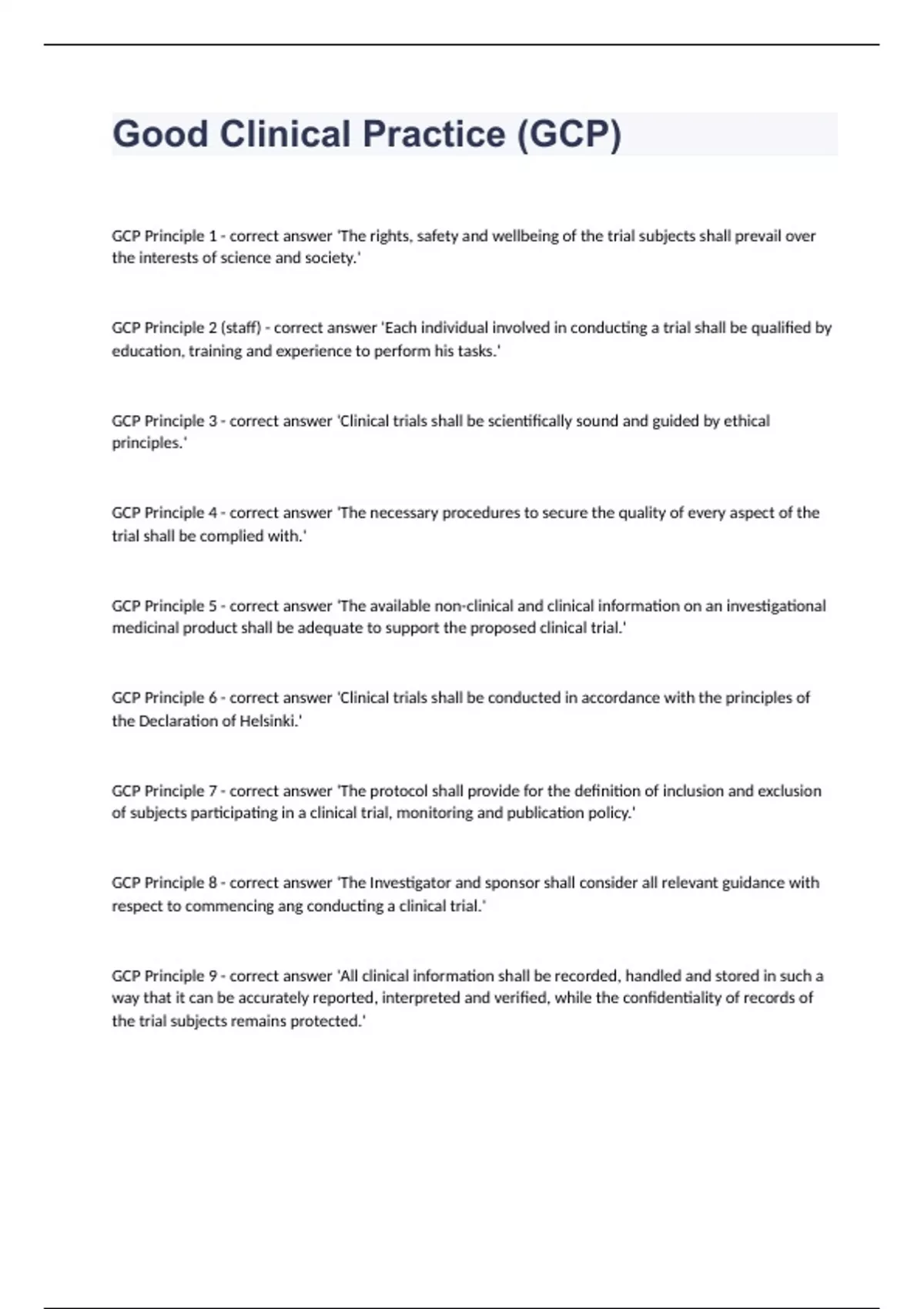 Good Clinical Practice (GCP)GCP Principle 1 - correct answer 'The rights, safety and wellbeing of the trial subjects shall prevail over the interests of science and society.' GCP Principle 2 (staff) - correct answer 'Each individual involved in conducting a trial shall be qualified by education, training and experience to perform his tasks.' GCP Principle 3 - correct answer 'Clinical trials shall be scientifically sound and guided by ethical principles.' GCP Principle 4 - correct answer 'The necessary procedures to secure the quality of every aspect of the trial shall be complied with.' GCP Principle 5 - correct answer 'The available non-clinical and clinical information on an investigational medicinal product shall be adequate to support the proposed clinical trial.' GCP Principle 6 - correct answer 'Clinical trials shall be conducted in accordance with the principles of the Declaration of Helsinki.' GCP Principle 7 - correct answer 'The protocol shall provide for the definition of inclusion and exclusion of subjects participating in a clinical trial, monitoring and publication policy.' GCP Principle 8 - correct answer 'The Investigator and sponsor shall consider all relevant guidance with respect to commencing ang conducting a clinical trial.' GCP Principle 9 - correct answer 'All clinical information shall be recorded, handled and stored in such a way that it can be accurately reported, interpreted and verified, while the confidentiality of records of the trial subjects remains protected.'