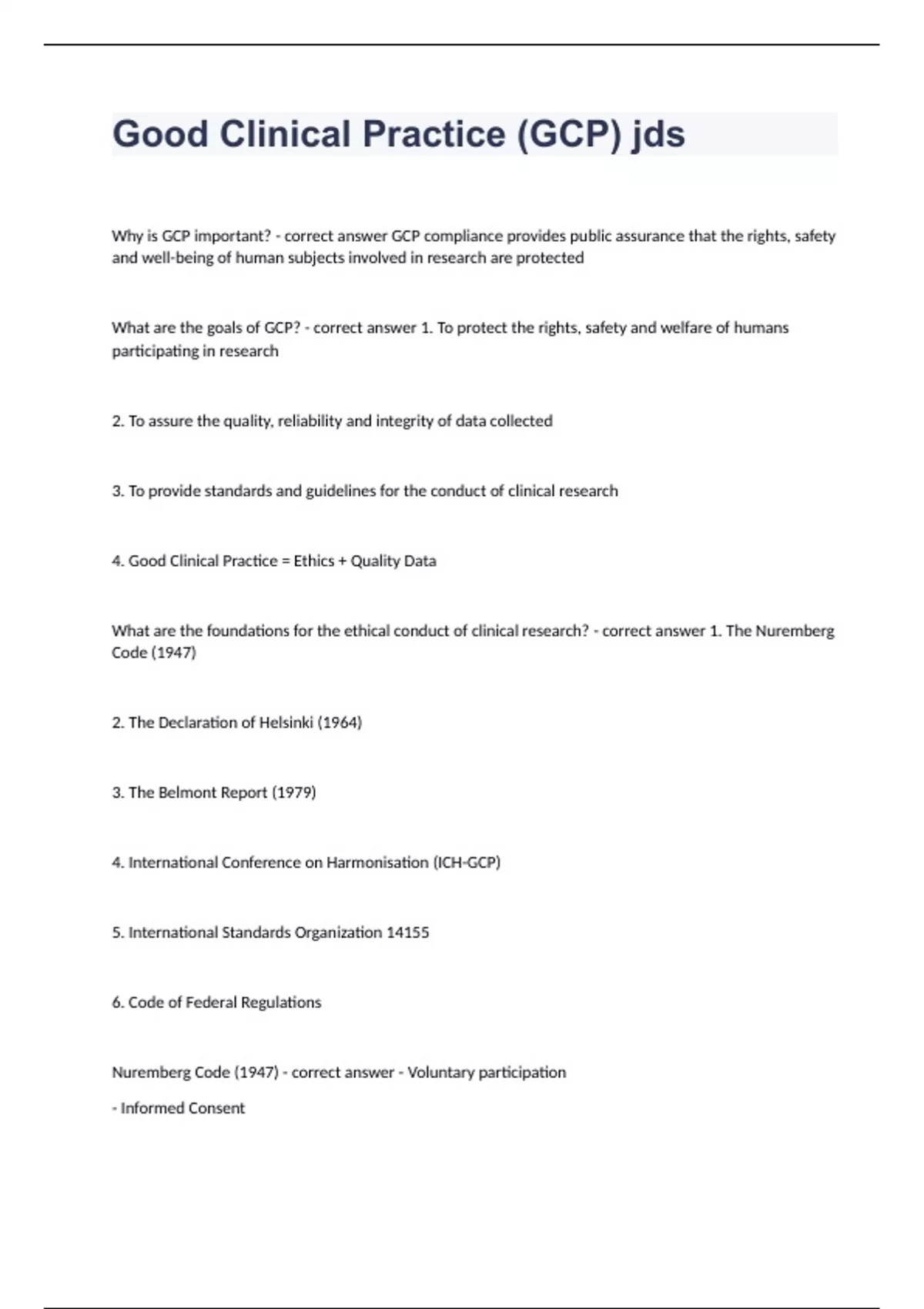 Good Clinical Practice (GCP) Why is GCP important? - correct answer GCP compliance provides public assurance that the rights, safety and well-being of human subjects involved in research are protected What are the goals of GCP? - correct answer 1. To protect the rights, safety and welfare of humans participating in research 2. To assure the quality, reliability and integrity of data collected 3. To provide standards and guidelines for the conduct of clinical research 4. Good Clinical Practice = Ethics + Quality Data What are the foundations for the ethical conduct of clinical research? - correct answer 1. The Nuremberg Code (1947) 2. The Declaration of Helsinki (1964) 3. The Belmont Report (1979) 4. International Conference on Harmonisation (ICH-GCP) 5. International Standards Organization 14155 6. Code of Federal Regulations Nuremberg Code (1947) - correct answer - Voluntary participation - Informed Consent