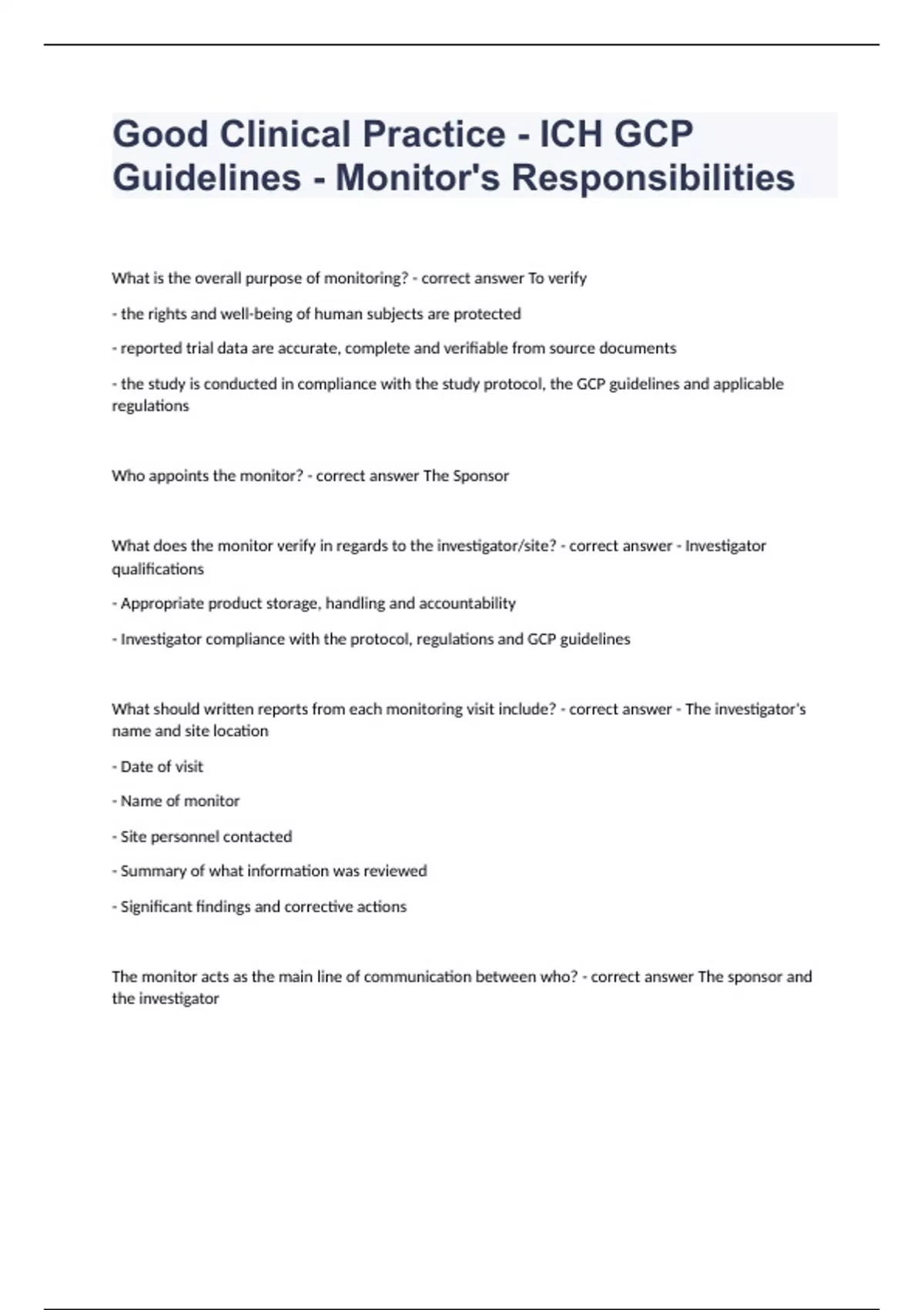 Good Clinical Practice - ICH GCP Guidelines - Monitor's ResponsibilitiesWhat is the overall purpose of monitoring? - correct answer To verify - the rights and well-being of human subjects are protected - reported trial data are accurate, complete and verifiable from source documents - the study is conducted in compliance with the study protocol, the GCP guidelines and applicable regulations Who appoints the monitor? - correct answer The Sponsor What does the monitor verify in regards to the investigator/site? - correct answer - Investigator qualifications - Appropriate product storage, handling and accountability - Investigator compliance with the protocol, regulations and GCP guidelines What should written reports from each monitoring visit include? - correct answer - The investigator's name and site location - Date of visit - Name of monitor - Site personnel contacted - Summary of what information was reviewed - Significant findings and corrective actions The monitor acts as the main line of communication between who? - correct answer The sponsor and the investigator