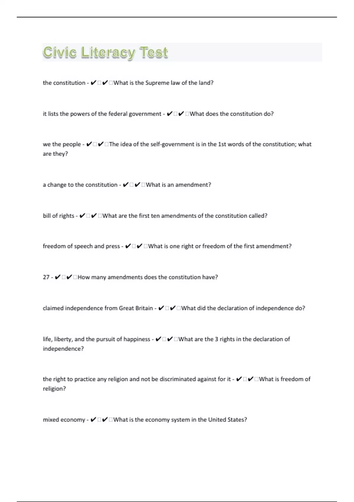the constitution - ️️What is the Supreme law of the land? it lists the powers of the federal government - ️️What does the constitution do? we the people - ️️The idea of the self-government is in the 1st words of the constitution; what are they? a change to the constitution - ️️What is an amendment? bill of rights - ️️What are the first ten amendments of the constitution called? freedom of speech and press - ️️What is one right or freedom of the first amendment? 27 - ️️How many amendments does the constitution have? claimed independence from Great Britain - ️️What did the declaration of independence do? life, liberty, and the pursuit of happiness - ️️What are the 3 rights in the declaration of independence? the right to practice any religion and not be discriminated against for it - ️️What is freedom of religion? mixed economy - ️️What is the economy system in the United States?