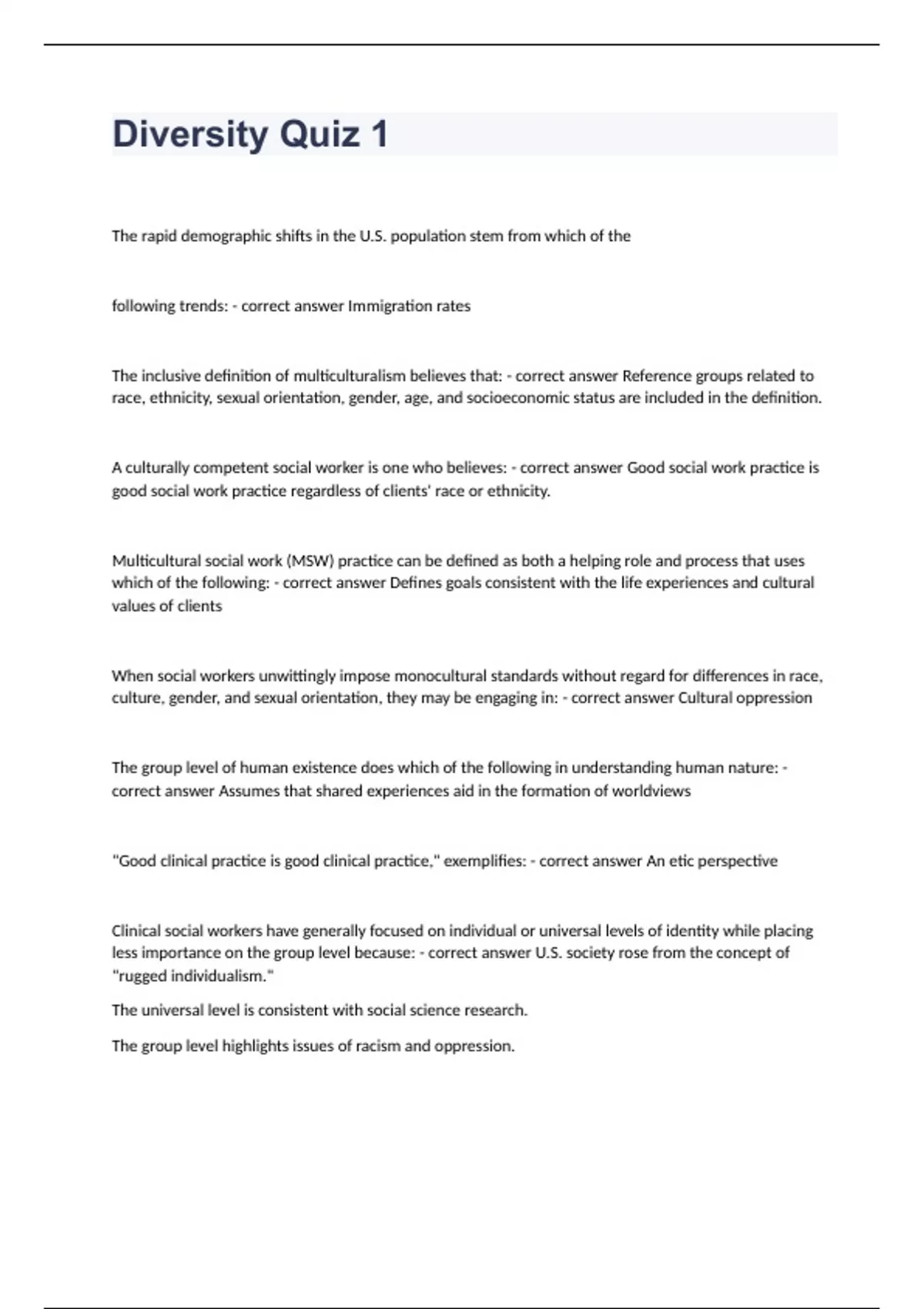 Diversity Quiz 1The rapid demographic shifts in the U.S. population stem from which of the following trends: - correct answer Immigration rates The inclusive definition of multiculturalism believes that: - correct answer Reference groups related to race, ethnicity, sexual orientation, gender, age, and socioeconomic status are included in the definition. A culturally competent social worker is one who believes: - correct answer Good social work practice is good social work practice regardless of clients' race or ethnicity. Multicultural social work (MSW) practice can be defined as both a helping role and process that uses which of the following: - correct answer Defines goals consistent with the life experiences and cultural values of clients When social workers unwittingly impose monocultural standards without regard for differences in race, culture, gender, and sexual orientation, they may be engaging in: - correct answer Cultural oppression The group level of human existence does which of the following in understanding human nature: - correct answer Assumes that shared experiences aid in the formation of worldviews "Good clinical practice is good clinical practice," exemplifies: - correct answer An etic perspective
