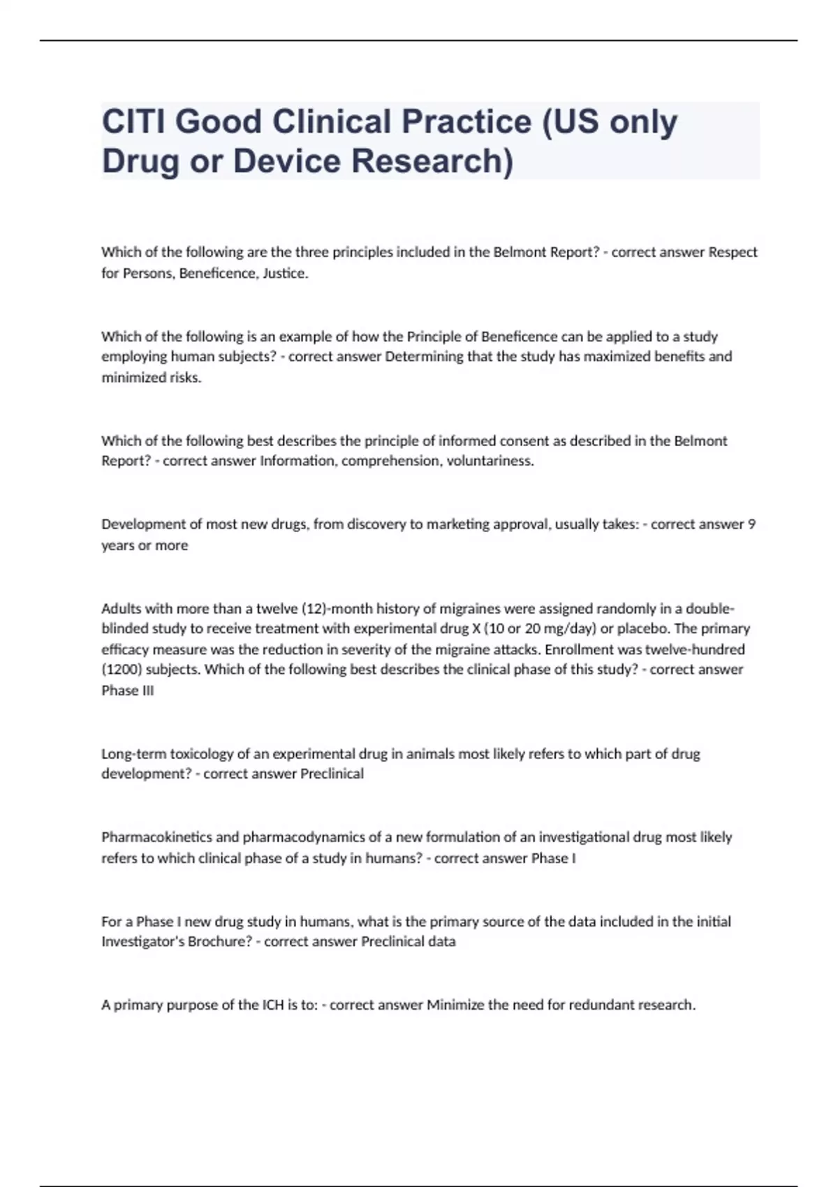 CITI Good Clinical Practice (US only Drug or Device Research)Which of the following are the three principles included in the Belmont Report? - correct answer Respect for Persons, Beneficence, Justice. Which of the following is an example of how the Principle of Beneficence can be applied to a study employing human subjects? - correct answer Determining that the study has maximized benefits and minimized risks. Which of the following best describes the principle of informed consent as described in the Belmont Report? - correct answer Information, comprehension, voluntariness. Development of most new drugs, from discovery to marketing approval, usually takes: - correct answer 9 years or more Adults with more than a twelve (12)-month history of migraines were assigned randomly in a double-blinded study to receive treatment with experimental drug X (10 or 20 mg/day) or placebo. The primary efficacy measure was the reduction in severity of the migraine attacks. Enrollment was twelve-hundred (1200) subjects. Which of the following best describes the clinical phase of this study? - correct answer Phase III Long-term toxicology of an experimental drug in animals most likely refers to which part of drug development? - correct answer Preclinical Pharmacokinetics and pharmacodynamics of a new formulation of an investigational drug most likely refers to which clinical phase of a study in humans? - correct answer Phase I For a Phase I new drug study in humans, what is the primary source of the data included in the initial Investigator's Brochure? - correct answer Preclinical data A primary purpose of the ICH is to: - correct answer Minimize the need for redundant research.