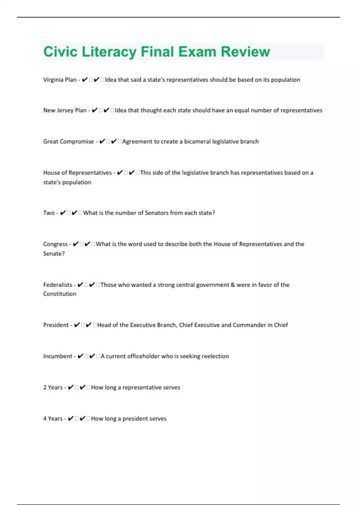 Virginia Plan - ️️Idea that said a state's representatives should be based on its population New Jersey Plan - ️️Idea that thought each state should have an equal number of representatives Great Compromise - ️️Agreement to create a bicameral legislative branch House of Representatives - ️️This side of the legislative branch has representatives based on a state's population Two - ️️What is the number of Senators from each state? Congress - ️️What is the word used to describe both the House of Representatives and the Senate? Federalists - ️️Those who wanted a strong central government & were in favor of the Constitution President - ️️Head of the Executive Branch, Chief Executive and Commander in Chief Incumbent - ️️A current officeholder who is seeking reelection 2 Years - ️️How long a representative serves 4 Years - ️️How long a president serves