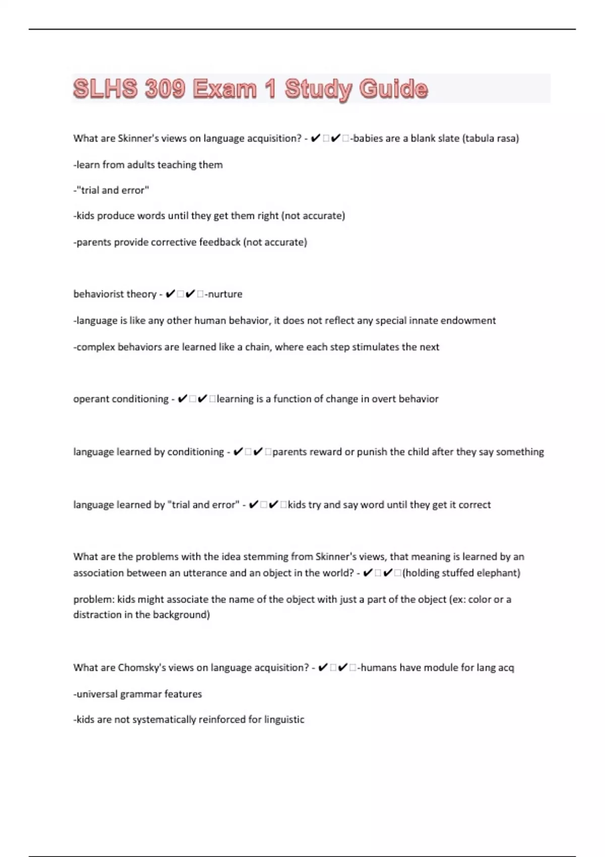 What are Skinner's views on language acquisition? - ️️-babies are a blank slate (tabula rasa) -learn from adults teaching them -"trial and error" -kids produce words until they get them right (not accurate) -parents provide corrective feedback (not accurate) behaviorist theory - ️️-nurture -language is like any other human behavior, it does not reflect any special innate endowment -complex behaviors are learned like a chain, where each step stimulates the next operant conditioning - ️️learning is a function of change in overt behavior language learned by conditioning - ️️parents reward or punish the child after they say something language learned by "trial and error" - ️️kids try and say word until they get it correct What are the problems with the idea stemming from Skinner's views, that meaning is learned by an association between an utterance and an object in the world? - ️️(holding stuffed elephant) problem: kids might associate the name of the object with just a part of the object (ex: color or a distraction in the background) What are Chomsky's views on language acquisition? - ️️-humans have module for lang acq -universal grammar features -kids are not systematically reinforced for linguistic