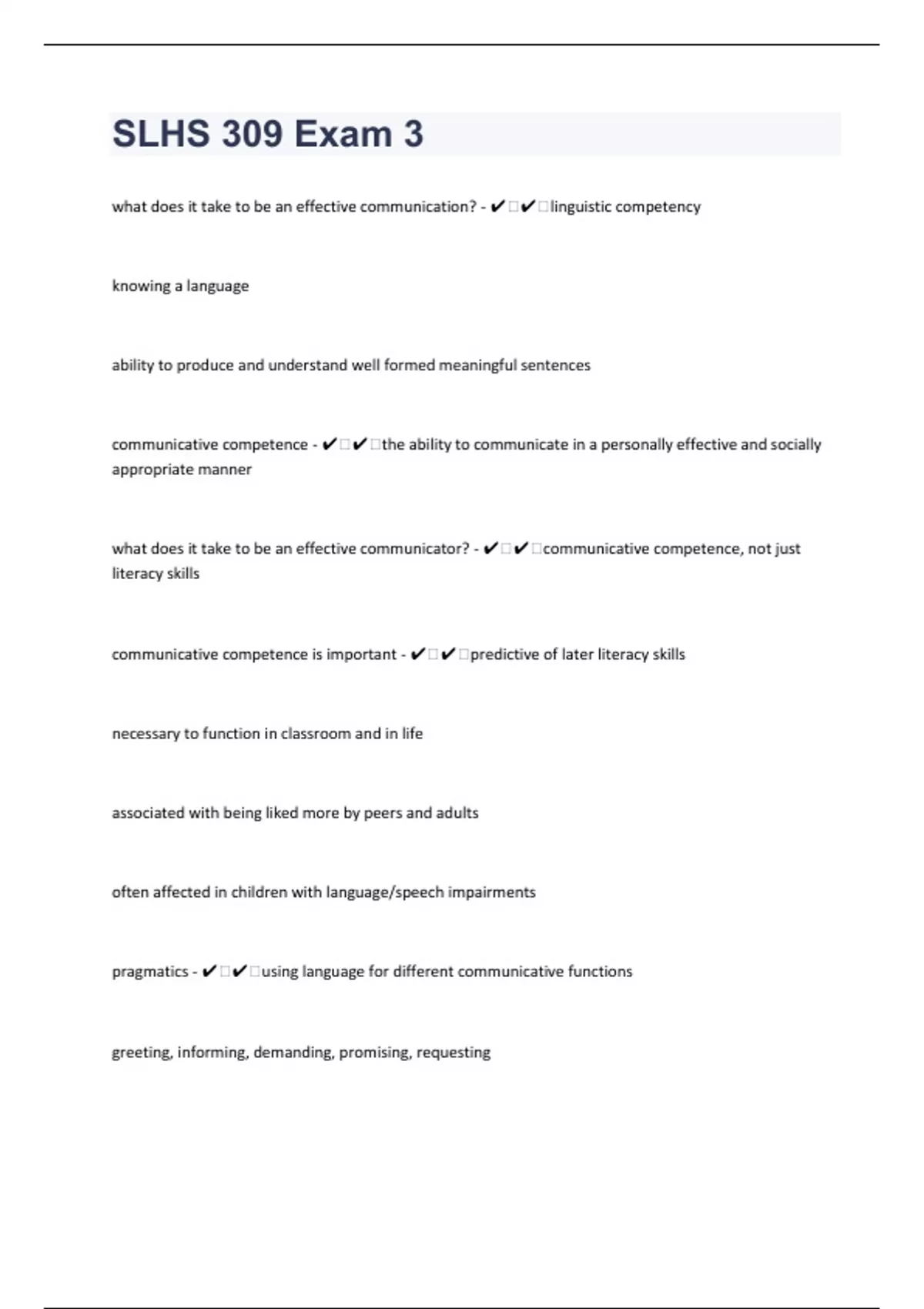 what does it take to be an effective communication? - ️️linguistic competency knowing a language ability to produce and understand well formed meaningful sentences communicative competence - ️️the ability to communicate in a personally effective and socially appropriate manner what does it take to be an effective communicator? - ️️communicative competence, not just literacy skills communicative competence is important - ️️predictive of later literacy skills necessary to function in classroom and in life associated with being liked more by peers and adults often affected in children with language/speech impairments pragmatics - ️️using language for different communicative functions greeting, informing, demanding, promising, requesting