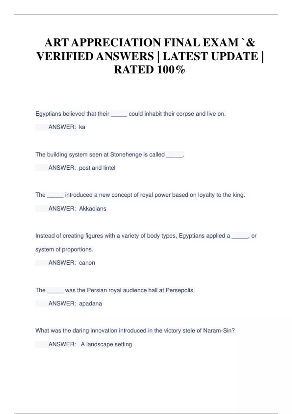 ART APPRECIATION FINAL EXAM `& VERIFIED ANSWERS | LATEST UPDATE | RATED 100%