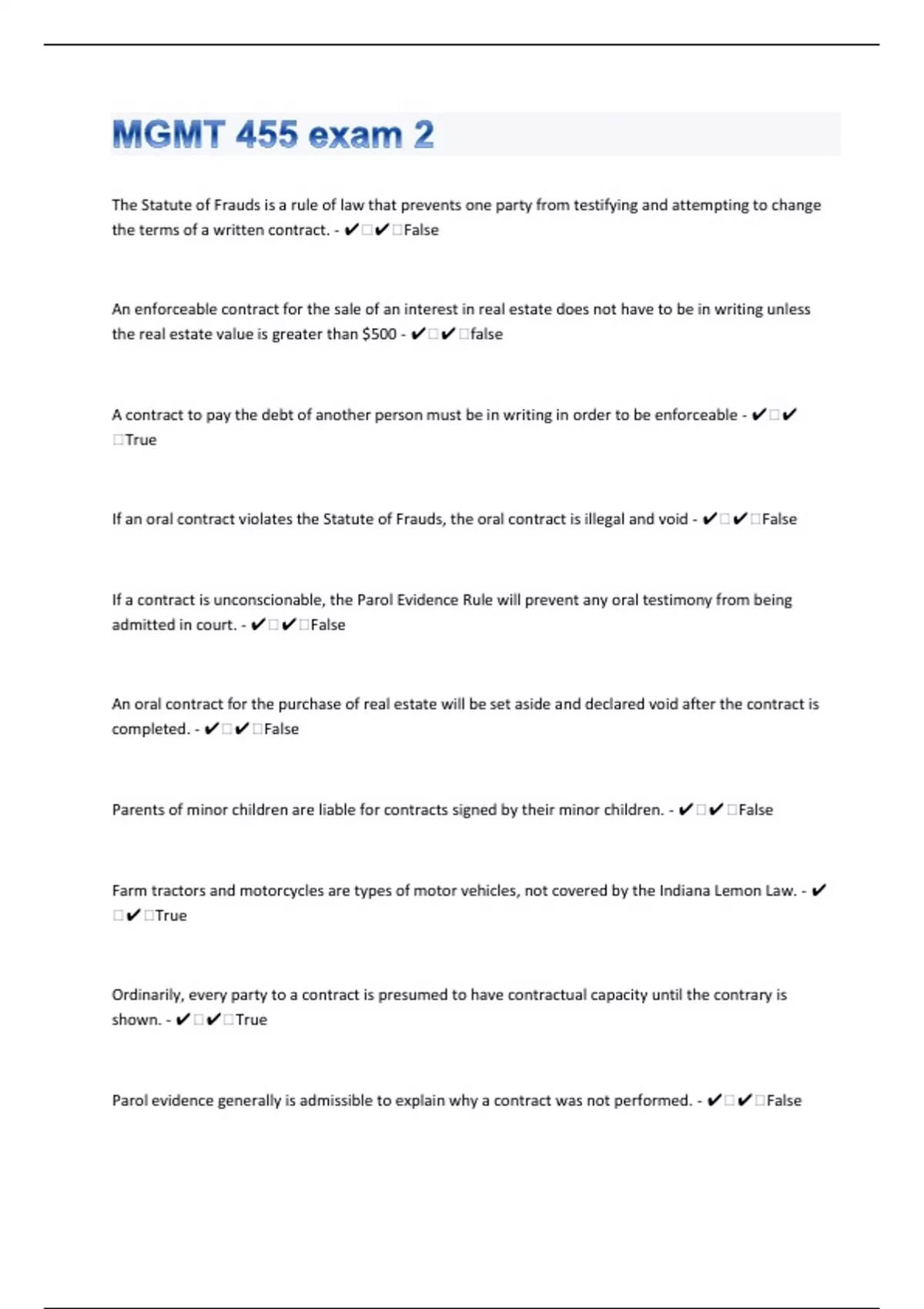 The Statute of Frauds is a rule of law that prevents one party from testifying and attempting to change the terms of a written contract. - ️️False An enforceable contract for the sale of an interest in real estate does not have to be in writing unless the real estate value is greater than $500 - ️️false A contract to pay the debt of another person must be in writing in order to be enforceable - ️️True If an oral contract violates the Statute of Frauds, the oral contract is illegal and void - ️️False If a contract is unconscionable, the Parol Evidence Rule will prevent any oral testimony from being admitted in court. - ️️False An oral contract for the purchase of real estate will be set aside and declared void after the contract is completed. - ️️False Parents of minor children are liable for contracts signed by their minor children. - ️️False Farm tractors and motorcycles are types of motor vehicles, not covered by the Indiana Lemon Law. - ️️True Ordinarily, every party to a contract is presumed to have contractual capacity until the contrary is shown. - ️️True Parol evidence generally is admissible to explain why a contract was not performed. - ️️False