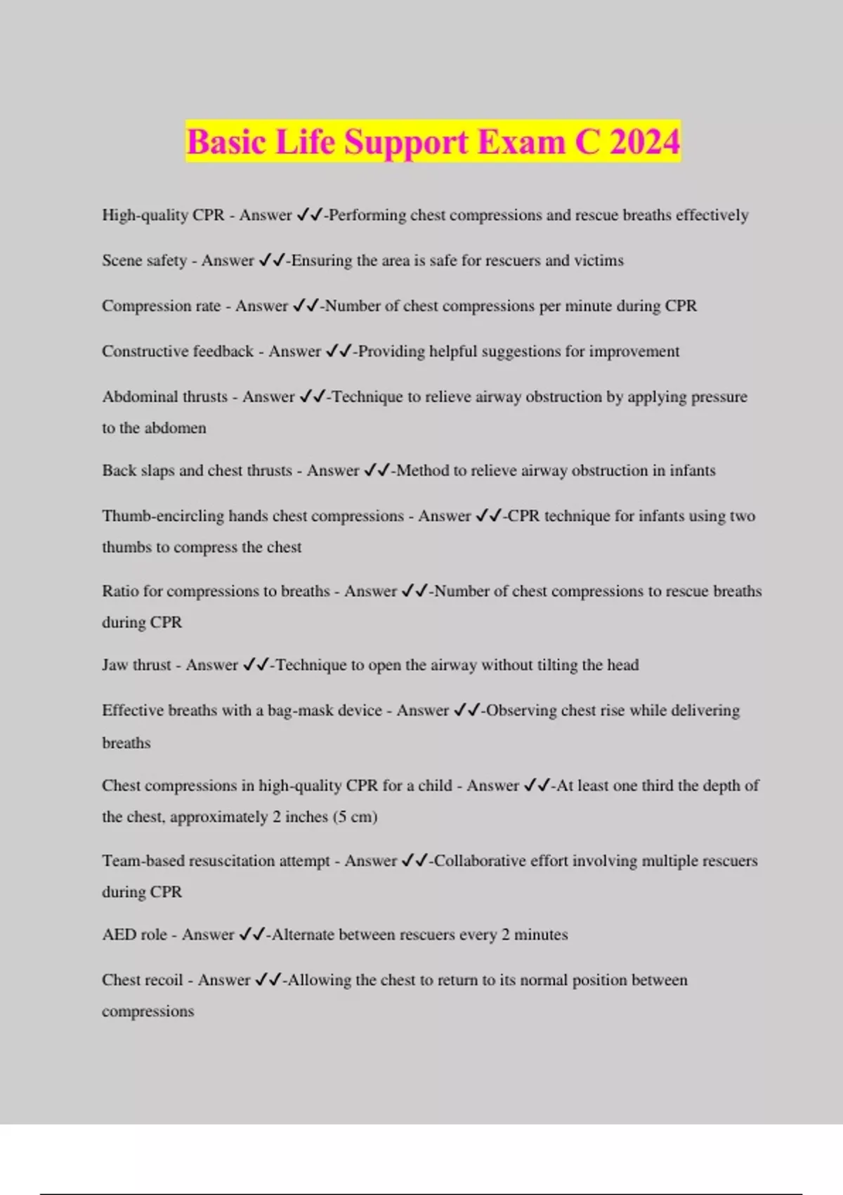 Basic Life Support Exam C 2024 High-quality CPR - Answer ️️ -Performing chest compressions and rescue breaths effectively Scene safety - Answer ️️ -Ensuring the area is safe for rescuers and victims Compression rate - Answer ️️ -Number of chest compressions per minute during CPR Constructive feedback - Answer ️️ -Providing helpful suggestions for improvement Abdominal thrusts - Answer ️️ -Technique to relieve airway obstruction by applying pressure to the abdomen Back slaps and chest thrusts - Answer ️️ -Method to relieve airway obstruction in infants Thumb-encircling hands chest compressions - Answer ️️ -CPR technique for infants using two thumbs to compress the chest Ratio for compressions to breaths - Answer ️️ -Number of chest compressions to rescue breaths during CPR Jaw thrust - Answer ️️ -Technique to open the airway without tilting the head Effective breaths with a bag-mask device - Answer ️️ -Observing chest rise while delivering breaths Chest compressions in high-quality CPR for a child - Answer ️️ -At least one third the depth of the chest, approximately 2 inches (5 cm)