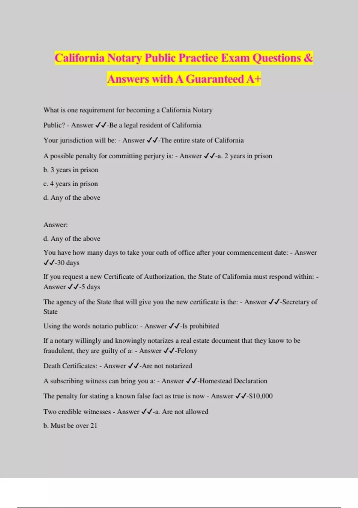 California Notary Public Practice Exam Questions & Answers with A Guaranteed A+ What is one requirement for becoming a California Notary Public? - Answer ️️ -Be a legal resident of California Your jurisdiction will be: - Answer ️️ -The entire state of California A possible penalty for committing perjury is: - Answer ️️ -a. 2 years in prison b. 3 years in prison c. 4 years in prison d. Any of the above Answer: d. Any of the above You have how many days to take your oath of office after your commencement date: - Answer ️️ -30 days If you request a new Certificate of Authorization, the State of California must respond within: - Answer ️️ -5 days The agency of the State that will give you the new certificate is the: - Answer ️️ -Secretary of State Using the words notario publico: - Answer ️️ -Is prohibited If a notary willingly and knowingly notarizes a real estate document that they know to be fraudulent, they are guilty of a: - Answer ️️ -Felony Death Certificates: - Answer ️️ -Are not notarized A subscribing witness can bring you a: - Answer ️️ -Homestead Declaration The penalty for stating a known false fact as true is now - Answer ️️ -$10,000 Two credible witnesses - Answer ️️ -a. Are not allowed b. Must be over 21 c. Must be fingerprinted d. None of the above Answer: d. None of the above When do you officially become a notary? - Answer ️️ -When your oath and bond are filed The notary stamp may be: - Answer ️️ -Rectangular The size of the stamp could be: - Answer ️️ -1 inch in width by 2 ½ inches in length If you are one of the following concerning a document, you must not notarize it: - Answer ️️ - Trustor or Trustee The fine for overcharging for a nonimmigration form is: - Answer ️️ -Up to $750 The fine for failing to notify the State that your stamp or journal was lost is: - Answer ️️ -Up to $1,500 Willful failure to provide a peace officer with a journal when requested is punishable by a civil penalty of up to: - Answer ️️ -$2,500 What is the fine for failing to post signs in English and in the other language that you use that you are not an attorney and cannot give legal advice: - Answer ️️ -Up to $1,500 fine and at least one year suspension of commission and on second time - revocation of commission for life When a regulation states 30 days it means: - Answer ️️ -Calendar days Your commission is dated 9/1/05 and you get your oath filed on 9/25/05. Your commission will expire: - Answer ️️ -8/31/09 The fee for notarizing a circulator's affidavit is: - Answer ️️ -$0 A notary can certify a copy of a power of attorney according to the: - Answer ️️ -Probate Code You may turn your journal over to: - Answer ️️ -A Peace Officer with probable cause During the signature by mark process, how many people write the name of the X signer: - Answer ️️ -One If you move, you must contact the: - Answer ️️ -Secretary of