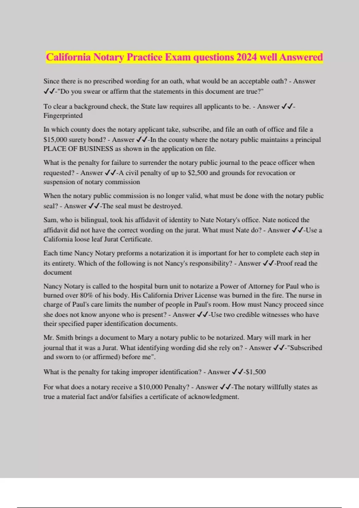California Notary Practice Exam questions 2024 well Answered Since there is no prescribed wording for an oath, what would be an acceptable oath? - Answer ️️ -"Do you swear or affirm that the statements in this document are true?" To clear a background check, the State law requires all applicants to be. - Answer ️️ - Fingerprinted In which county does the notary applicant take, subscribe, and file an oath of office and file a $15,000 surety bond? - Answer ️️ -In the county where the notary public maintains a principal PLACE OF BUSINESS as shown in the application on file. What is the penalty for failure to surrender the notary public journal to the peace officer when requested? - Answer ️️ -A civil penalty of up to $2,500 and grounds for revocation or suspension of notary commission When the notary public commission is no longer valid, what must be done with the notary public seal? - Answer ️️ -The seal must be destroyed. Sam, who is bilingual, took his affidavit of identity to Nate Notary's office. Nate noticed the affidavit did not have the correct wording on the jurat. What must Nate do? - Answer ️️ -Use a California loose leaf Jurat Certificate. Each time Nancy Notary preforms a notarization it is important for her to complete each step in its entirety. Which of the following is not Nancy's responsibility? - Answer ️️ -Proof read the document Nancy Notary is called to the hospital burn unit to notarize a Power of Attorney for Paul who is burned over 80% of his body. His California Driver License was burned in the fire. The nurse in charge of Paul's care limits the number of people in Paul's room. How must Nancy proceed since she does not know anyone who is present? - Answer ️️ -Use two credible witnesses who have their specified paper identification documents. Mr. Smith brings a document to Mary a notary public to be notarized. Mary will mark in her journal that it was a Jurat. What identifying wording did she rely on? - Answer ️️ -"Subscribed and sworn to (or affirmed) before me". What is the penalty for taking improper identification? - Answer ️️ -$1,500 For what does a notary receive a $10,000 Penalty? - Answer ️️ -The notary willfully states as true a material fact and/or falsifies a certificate of acknowledgment.