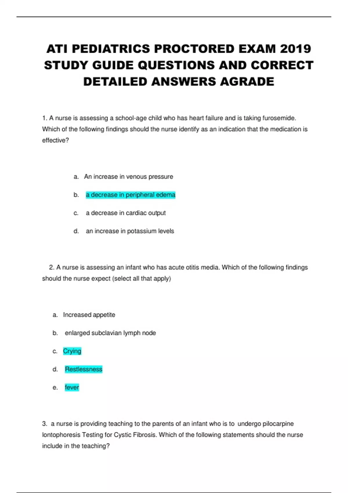 ATI PEDIATRICS PROCTORED EXAM 2019 STUDY GUIDE QUESTIONS AND CORRECT DETAILED ANSWERS AGRADE