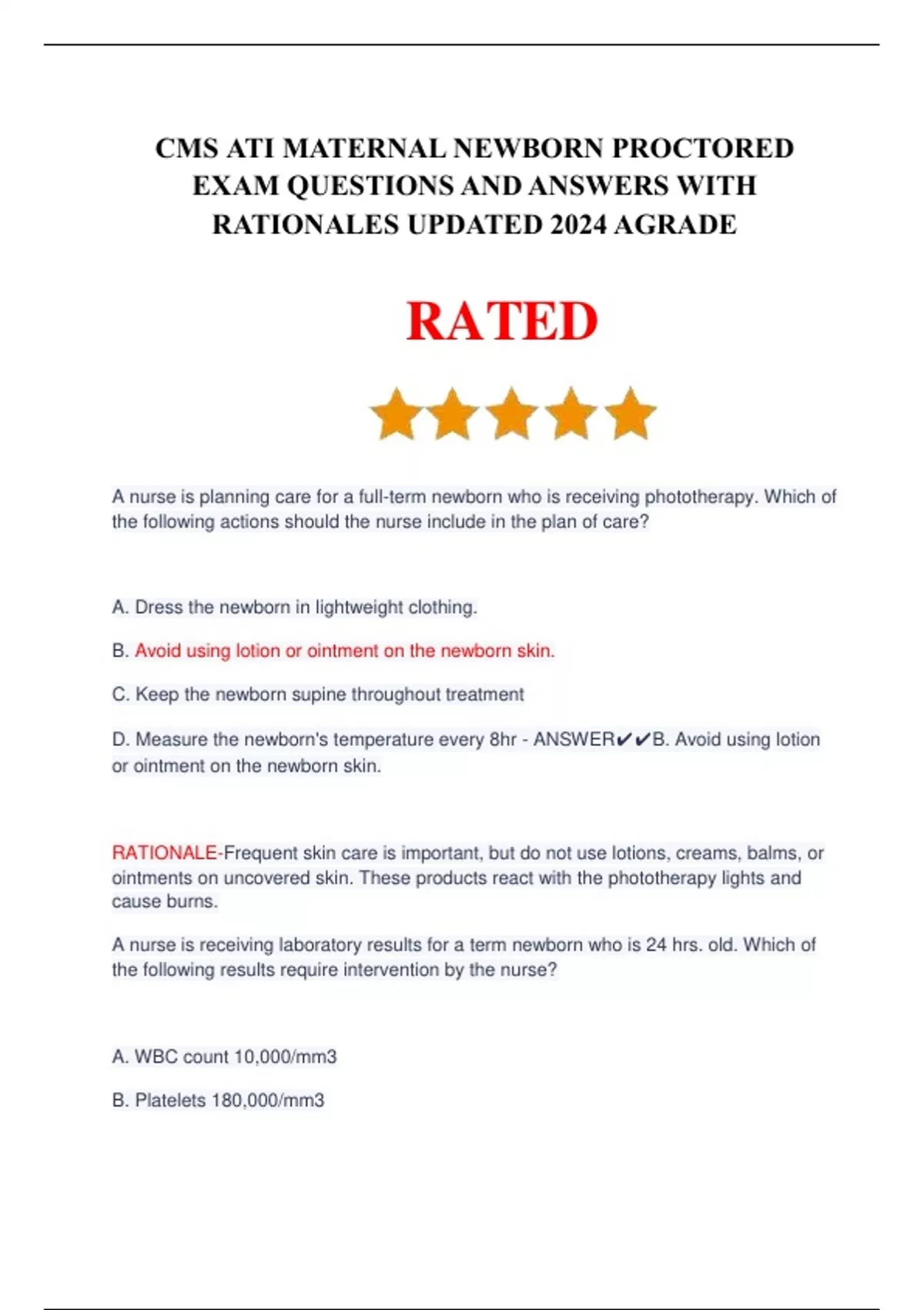 CMS ATI MATERNAL NEWBORN PROCTORED EXAM QUESTIONS AND ANSWERS WITH RATIONALES UPDATED 2024 AGRADE