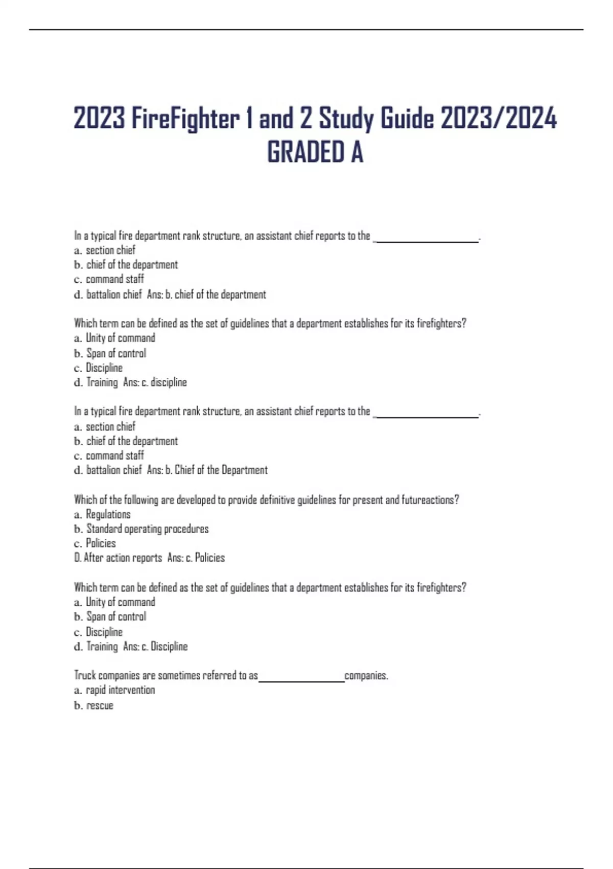 2023 FireFighter 1 and 2 Study Guide 2023/2024 GRADED A In a typical fire department rank structure, an assistant chief reports to the _ . a. sectionchief b. chief of the department c. commandstaff d. battalion chief Ans:b. chief of the department Which term can be definedas the set of guidelines that a department establishes for its firefighters? a. Unityof command b. Span of control c. Discipline d. Training Ans: c. discipline In a typical fire department rank structure, an assistant chief reports to the _ . a. sectionchief b. chief of the department c. commandstaff d. battalion chief Ans:b. Chief of the Department Which of the following aredeveloped to provide definitive guidelines for present and futureactions? a. Regulations b. Standard operatingprocedures c. Policies D. After action reports Ans: c. Policies Which term can be definedas the set of guidelines that a department establishes for its firefighters? a. Unityof command b. Span of control c. Discipline d. Training Ans: c. Discipline Truck companies aresometimes referredto as companies. a. rapid intervention b. rescue c. ladder e Ans: c. Ladder For whom should fire fighters consider that they work? a. The tax payingcitizens b. Themselves c. Their supervisors d. Their team Ans:a. the tax paying citizens The number of people whom one person can supervise effectively is known as . a. chain of command b. division of labor c. span of control d. functional supervision Ans: c. span of control Which development ledto the widespread use of the mechanized pumping apparatus? a. Private insurance companies b. Wagon mountedsteam engines c. Jacketed hose d. Internalcombustionengines Ans:d. Internal combustionengines In the fire service, the bugle has become a symbol of . a. authority b. courage c. fraternity d. service Ans: a. authority Medical requirements for fire fighters arespecified in which NFPA standard?a. 1002 b. 1582 c. 1962 d. 904 Ans: b. 1582 Which type of company specializes insaving victims from fires, confined spaces, trenches, andhigh angle situations? a. Rescue b. Rapid Intervention c. Truck d. Engine Ans:a. Rescue NFPA standards are . a. regulatory law b. administrative law c. consensus documents d. modelcodes Ans: c. consensus documents Whichrank is directlyabove a lieutenant in the fire service? a. Division/groupsupervisor b. Divisionchief c. Captain d. Battalion chief Ans: c. Captain What does the "S" stand for in "SOP"? a. Standard b. Sequential c. Specific d. Special Ans: a. Standard Where was the first fire insurance companyformed in America? a. New York, New York b. Boston, Massachusetts c. Charleston, South Carolina d. Chicago, Illinois Ans: c. Charleston, South Carolina Training and performance qualifications for firefighters arespecified in which NFPA standard?a. 1021 b. 472 c. 1001 d. 1500 Ans: c. 1001 Which position specializes in reviewing plans for fire detection and suppression systems forfunctionalityand code compliance? a. Fireprotection engineer b. Fireprevention officer c. Firesystems specialist d. Fire marshal Ans:a. Fireprotection engineer Who developed the first fire hydrant? a. John Lofton b. BenFranklin c. Hans Hautsch d. George Smith Ans: d. George Smith The individual responsible for the overall management of an incident is the . a. incident commander b. companyofficer c. commandingofficer d. operations chief Ans: a. incident commander The earliest known firedepartment was in . a. ancient Rome