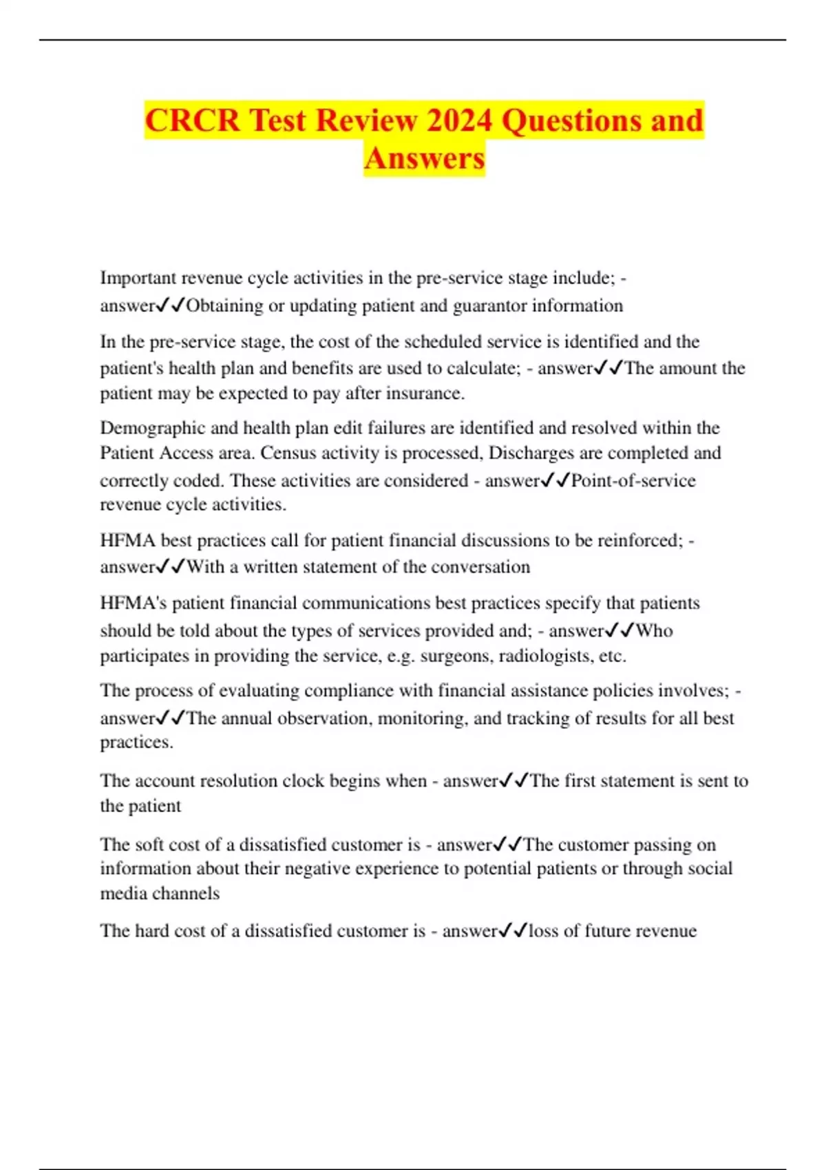 CRCR Test Review 2024 Questions and Answers Important revenue cycle activities in the pre-service stage include; - answerObtaining or updating patient and guarantor information In the pre-service stage, the cost of the scheduled service is identified and the patient's health plan and benefits are used to calculate; - answerThe amount the patient may be expected to pay after insurance. Demographic and health plan edit failures are identified and resolved within the Patient Access area. Census activity is processed, Discharges are completed and correctly coded. These activities are considered - answerPoint-of-service revenue cycle activities. HFMA best practices call for patient financial discussions to be reinforced; - answerWith a written statement of the conversation HFMA's patient financial communications best practices specify that patients should be told about the types of services provided and; - answerWho participates in providing the service, e.g. surgeons, radiologists, etc. The process of evaluating compliance with financial assistance policies involves; - answerThe annual observation, monitoring, and tracking of results for all best practices. The account resolution clock begins when - answerThe first statement is sent to the patien