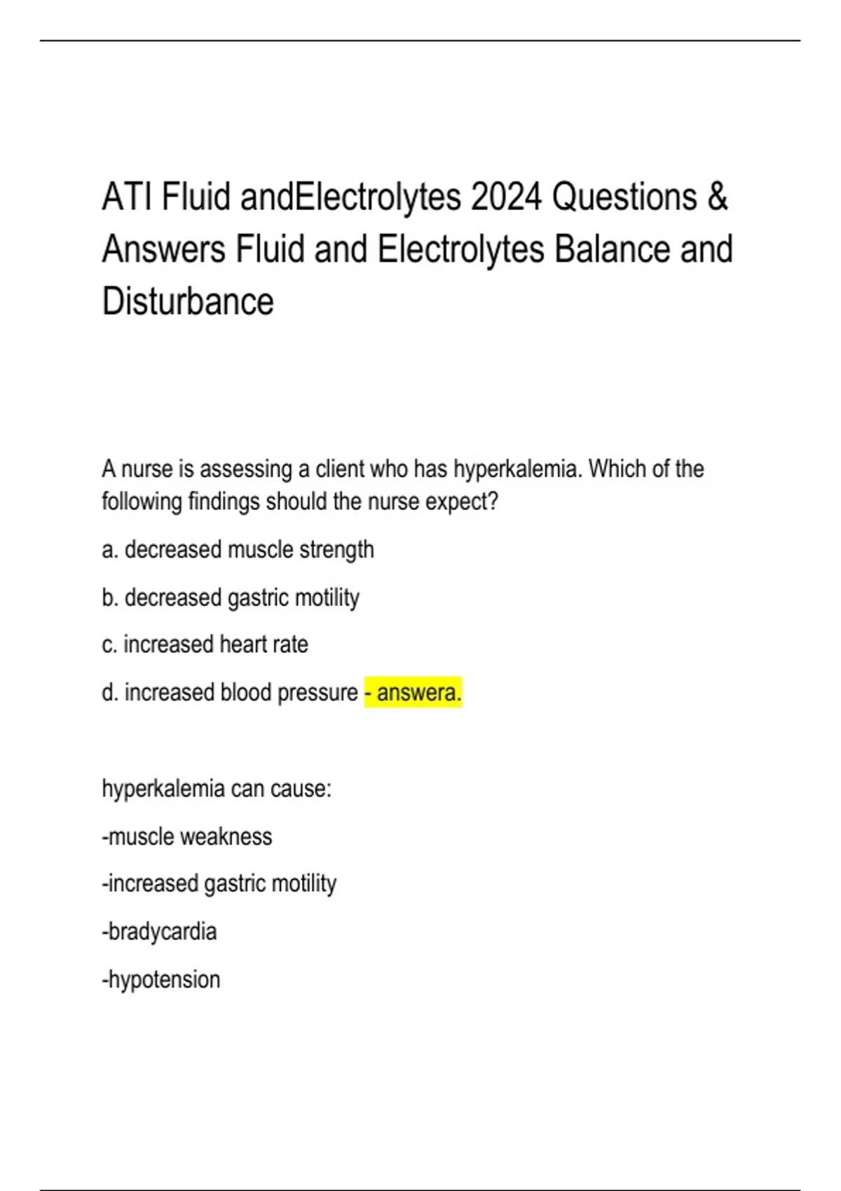 A nurse is assessing a client who has hyperkalemia. Which of the following findings should the nurse expect? a. decreased muscle strength b. decreased gastric motility c. increased heart rate d. increased blood pressure - answera. hyperkalemia can cause: -muscle weakness -increased gastric motility -bradycardia -hypotension A client who takes hydrochlorothiazide is confused and lethargic. Which lab value should the nurse report? a. sodium 128 mEq/L b. potassium 4.8 mEq/L c. calcium 9.1 mg/dL d. magnesium 2.0 mEq/L - answera. sodium levels: 136-145 mEq/L potassium levels: 3.5 to 5 mEq/L calcium levels: 9 to 10.5 mg/dL magnesium levels: 1.3 to 2.1 mEq/L ***know your normals****** *nurse should monitor for hypokalemia, hypercalcemia, and hypomagnesemia when taking hydrochlorothiazide A nursing assessing a client who is using a PCA following a thoracotomy. The client is SOB, restless, resp 28/min. ABG, ph-7.52, PaO2 89 mmHg, PaCO2 28, HCO3 24, Which action should the nurse take? a. instruct client to cough forcefully b. assist the client w/ ambulation c. provide calming interventions d. d/c the PCA - answerc. clients RR is above the expected range. calming the client should decrease the RR, which will cause the clients carbon dioxide levels to increase. This will help correct the pH imbalance. -coughing will not correct the ABG -ambulating can exacerbate the client's respiratory distress -d/c the PCA will not treat the cause of the ABG results and could exacerbate the clients respiratory distress A nurse is assessing pt w/ calcium of 8.1. What should the nurse assess? a. deep-tendon reflexes b. cardiac rhythm c. peripheral sensation d. bowel sounds - answerb.