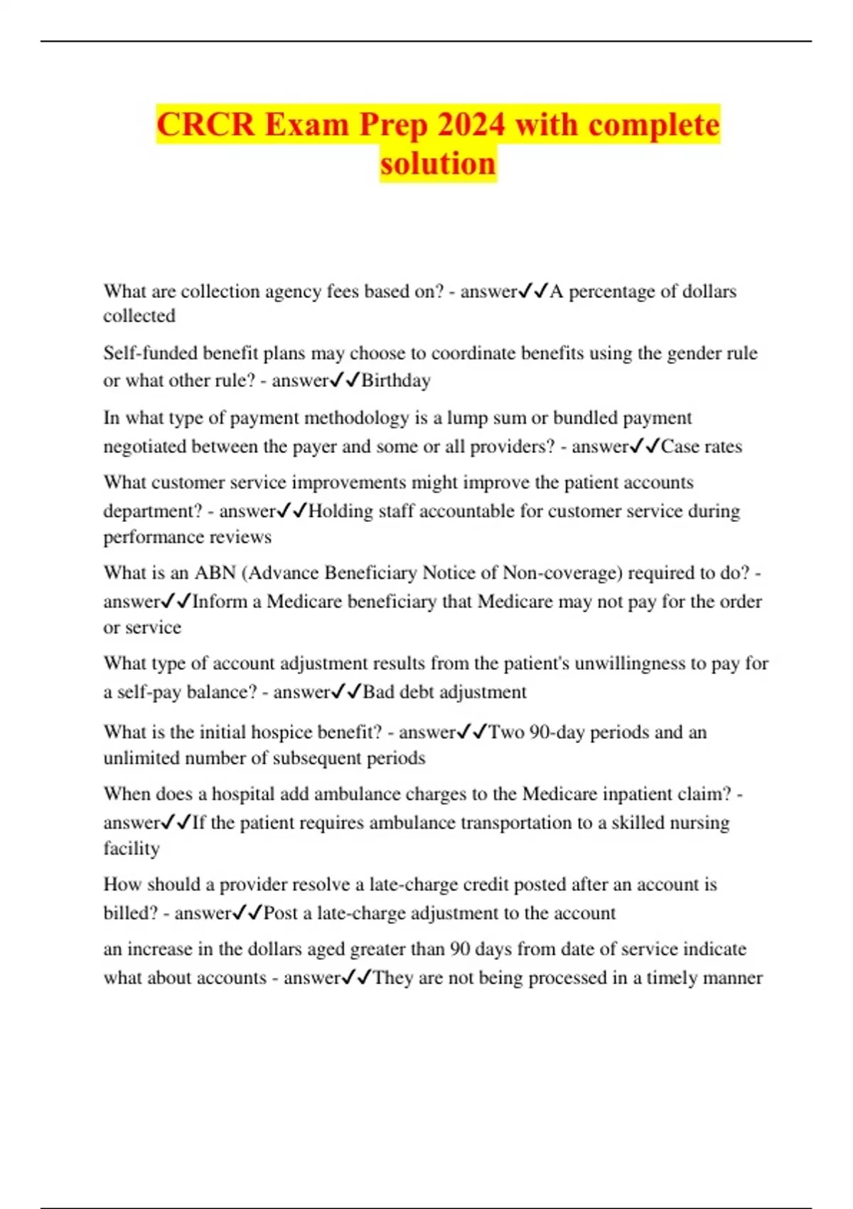 CRCR Exam Prep 2024 with complete solution What are collection agency fees based on? - answerA percentage of dollars collected Self-funded benefit plans may choose to coordinate benefits using the gender rule or what other rule? - answerBirthday In what type of payment methodology is a lump sum or bundled payment negotiated between the payer and some or all providers? - answerCase rates What customer service improvements might improve the patient accounts department? - answerHolding staff accountable for customer service during performance reviews What is an ABN (Advance Beneficiary Notice of Non-coverage) required to do? - answerInform a Medicare beneficiary that Medicare may not pay for the order or service What type of account adjustment results from the patient's unwillingness to pay for a self-pay balance? - answerBad debt adjustment What is the initial hospice benefit? - answerTwo 90-day periods and an unlimited number of subsequent periods When does a hospital add ambulance charges to the Medicare inpatient claim? - answerIf the patient requires ambulance transportation to a skilled nursing facility How should a provider resolve a late-charge credit posted after an account is billed? - answerPost a late-charge adjustment to the account an increase in the dollars aged greater than 90 days from date of service indicate what about accounts - answerThey are not being processed in a timely manner What is an advantage of a preregistration program? - answerIt reduces processing times at the time of service What are the two statutory exclusions from hospice coverage? - answerMedically unnecessary services and custodi