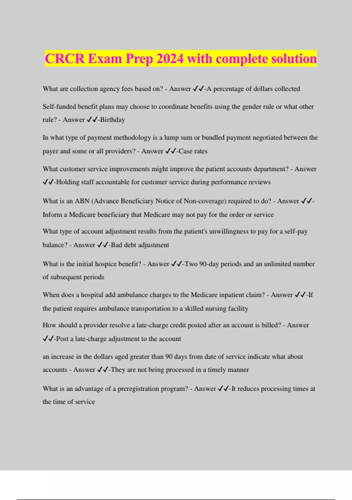 CRCR Exam Prep 2024 with complete solution What are collection agency fees based on? - Answer ️️ -A percentage of dollars collected Self-funded benefit plans may choose to coordinate benefits using the gender rule or what other rule? - Answer ️️ -Birthday In what type of payment methodology is a lump sum or bundled payment negotiated between the payer and some or all providers? - Answer ️️ -Case rates What customer service improvements might improve the patient accounts department? - Answer ️️ -Holding staff accountable for customer service during performance reviews What is an ABN (Advance Beneficiary Notice of Non-coverage) required to do? - Answer ️️ - Inform a Medicare beneficiary that Medicare may not pay for the order or service What type of account adjustment results from the patient's unwillingness to pay for a self-pay balance? - Answer ️️ -Bad debt adjustment What is the initial hospice benefit? - Answer ️️ -Two 90-day periods and an unlimited number of subsequent periods When does a hospital add ambulance charges to the Medicare inpatient claim? - Answer ️️ -If the patient requires ambulance transportation to a skilled nursing facility How should a provider resolve a late-charge credit posted after an account is billed? - Answer ️️ -Post a late-charge adjustment to the account an increase in the dollars aged greater than 90 days from date of service indicate what about accounts - Answer ️️ -They are not being processed in a timely manner What is an advantage of a preregistration program? - Answer ️️ -It reduces processing times at the time of service What are the two statutory exclusions from hospice coverage? - Answer ️️ -Medically unnecessary services and custodial care What core financial activities are resolved within patient access? - Answer ️️ -Scheduling, insurance verification, discharge processing, and payment of point-of-service receipts What statement applies to the scheduled outpatient? - Answer ️️ -The services do not involve an overnight stay How is a mis-posted contractual allowance resolved? - Answer ️️ -Comparing the contract reimbursement rates with the contract on the admittance advice to identify the correct amount What type of patient status is used to evaluate the patient's need for inpatient care? - Answer ️️ -Observation Coverage rules for Medicare beneficiaries receiving skilled nursing care require that the beneficiary has received what? - Answer ️️ -Medically necessary inpatient hospital services for at least 3 consecutive days before the skilled nursing care admission When is the word "SAME" entered on the CMS 1500 billing form in Field 0$? - Answer ️️ - When the patient is the insured What are non-emergency patients who come for service without prior notification to the provider called? - Answer ️️ -Unscheduled patients If the insurance verification response reports that a subscriber has a single policy, what is the status of the subscriber's spouse? - Answer ️️ -Neither enrolled not entitled to benefits Regulation Z of the Consumer Credit Protection Act, also known as the Truth in Lending Act, establishes what? - Answer ️️ -Disclosure rules for consumer credit s