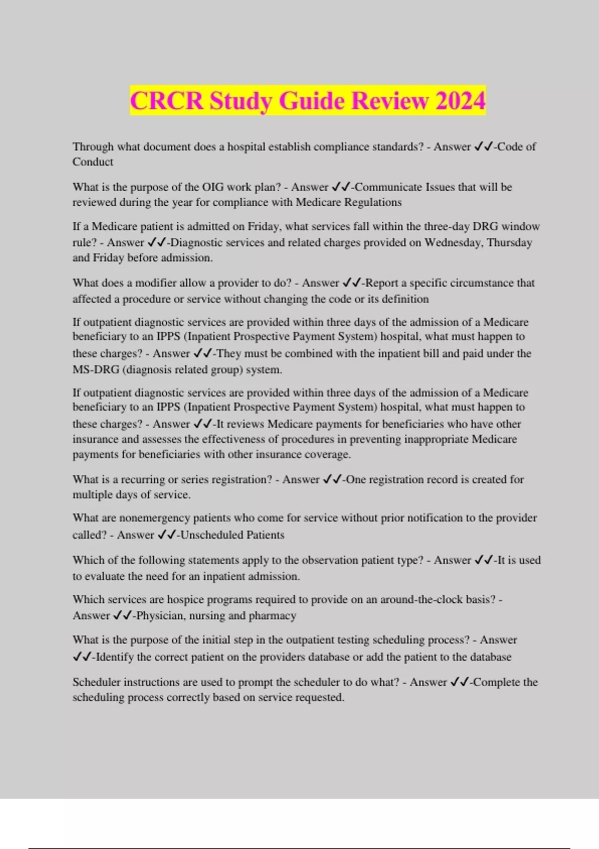 CRCR Study Guide Review 2024 Through what document does a hospital establish compliance standards? - Answer ️️ -Code of Conduct What is the purpose of the OIG work plan? - Answer ️️ -Communicate Issues that will be reviewed during the year for compliance with Medicare Regulations If a Medicare patient is admitted on Friday, what services fall within the three-day DRG window rule? - Answer ️️ -Diagnostic services and related charges provided on Wednesday, Thursday and Friday before admission. What does a modifier allow a provider to do? - Answer ️️ -Report a specific circumstance that affected a procedure or service without changing the code or its definition If outpatient diagnostic services are provided within three days of the admission of a Medicare beneficiary to an IPPS (Inpatient Prospective Payment System) hospital, what must happen to these charges? - Answer ️️ -They must be combined with the inpatient bill and paid under the MS-DRG (diagnosis related group) system. If outpatient diagnostic services are provided within three days of the admission of a Medicare beneficiary to an IPPS (Inpatient Prospective Payment System) hospital, what must happen to these charges? - Answer ️️ -It reviews Medicare payments for beneficiaries who have other insurance and assesses the effectiveness of procedures in preventing inappropriate Medicare payments for beneficiaries with other insurance coverage. What is a recurring or series registration? - Answer ️️ -One registration record is created for multiple days of service. What are nonemergency patients who come for service without prior notification to the provider called? - Answer ️️ -Unscheduled Patients Which of the following statements apply to the observation patient type? - Answer ️️ -It is used to evaluate the need for an inpatient admission. Which services are hospice programs required to provide on an around-the-clock basis? - Answer ️️ -Physician, nursing and pharmacy What is the purpose of the initial step in the outpatient testing scheduling process? - Answer ️️ -Identify the correct patient on the providers database or add the patient to the database Scheduler instructions are used to prompt the scheduler to do what? - Answer ️️ -Complete the scheduling process correctly based on service requested. The time needed to prepare the patient before service is the difference between the patient's arrival time and which of the following? - Answer ️️ -Procedure time Medicare guidelines require that when a test is ordered for which as LCD (local coverage determination) or NCD (national coverage determination) exist, the information provided on the order must include which of the following? - Answer ️️ -Documentation of the medical necessity of the test. What is an advantage of a preregistration program? - Answer ️️ -It reduces processing times at the time of service What data are required to establish a new MPI (master patient index) entry? - Answer ️️ -The patients full legal name, date of birth and sex Which HIPAA transition set provides electronic processing of insurance verification requests and responses? - Answer ️️ -The 270-271 Set A mother and father both cover their 16-year-old child as a dependent on their health insurance plans, which both follow the birthday rule. The mothers date of birth is January 19, 1968; the father's date of birth is July 19, 1967. Whose plan is the primary payer? - Answer ️️ -The Mothers Plan What is a co-payment? - Answer ️️ -The fixed amount that is due for a specific service A patient's annual out-of-pocket limitation is $3000, excluding the deductible. To date this calendar year, the patient has satisfied the $500 deductible and has paid $2300 in coinsurance to various providers. For the balance of the calendar year, what is the maximum amount of coinsurance the patient will owe? - Answer ️️ -$3000 - $2300 = $
