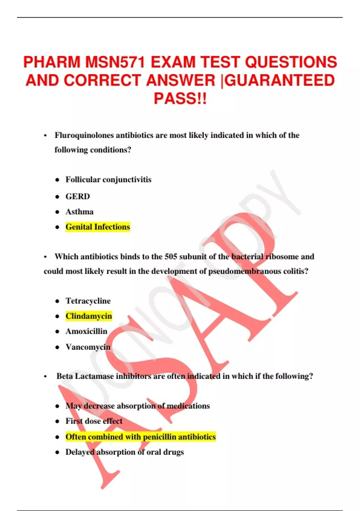 PHARM MSN571 EXAM TEST QUESTIONS AND CORRECT ANSWER |GUARANTEED PASS!! • Fluroquinolones antibiotics are most likely indicated in which of the following conditions? ● Follicular conjunctivitis ● GERD ● Asthma ● Genital Infections • Which antibiotics binds to the 505 subunit of the bacterial ribosome and could most likely result in the development of pseudomembranous colitis? ● Tetracycline ● Clindamycin ● Amoxicillin ● Vancomycin • Beta Lactamase inhibitors are often indicated in which if the following? ● May decrease absorption of medications ● First dose effect ● Often combined with penicillin antibiotics ● Delayed absorption of oral drugs • A patient who takes multiple antibiotics starts to experience diarrheal stool. If the stool sample tests positive for C-Diff which antibiotic, would you prescribe? Metronidaz ole Gemifloxac in Daptomyci n Rifaximin