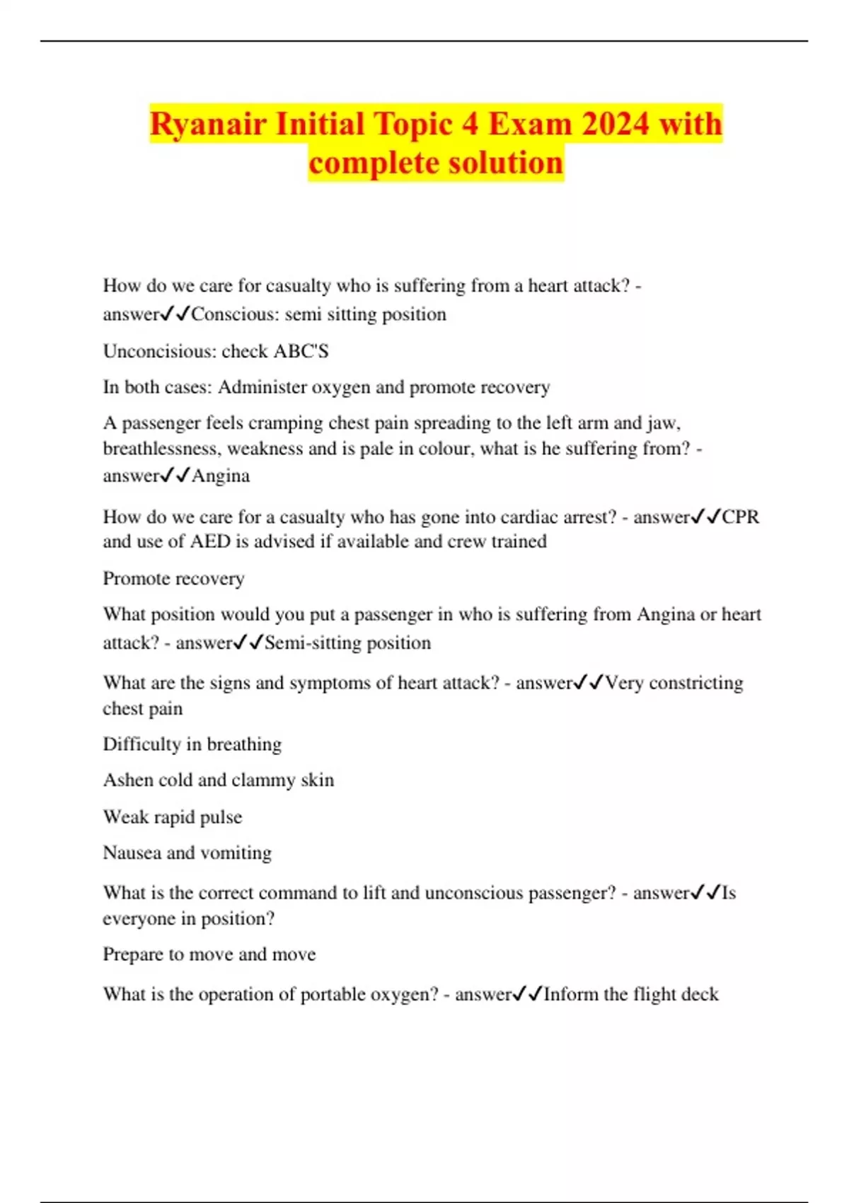 Ryanair Initial Topic 4 Exam 2024 with complete solution How do we care for casualty who is suffering from a heart attack? - answerConscious: semi sitting position Unconcisious: check ABC'S In both cases: Administer oxygen and promote recovery A passenger feels cramping chest pain spreading to the left arm and jaw, breathlessness, weakness and is pale in colour, what is he suffering from? - answerAngina How do we care for a casualty who has gone into cardiac arrest? - answerCPR and use of AED is advised if available and crew trained Promote recovery What position would you put a passenger in who is suffering from Angina or heart attack? - answerSemi-sitting position What are the signs and symptoms of heart attack? - answerVery constricting chest pain Difficulty in breathing Ashen cold and clammy skin Weak rapid pulse Nausea and vomiting What is the correct command to lift and unconscious passenger? - answerIs everyone in position? Prepare to move and move What is the operation of portable oxygen? - answerInform the flight