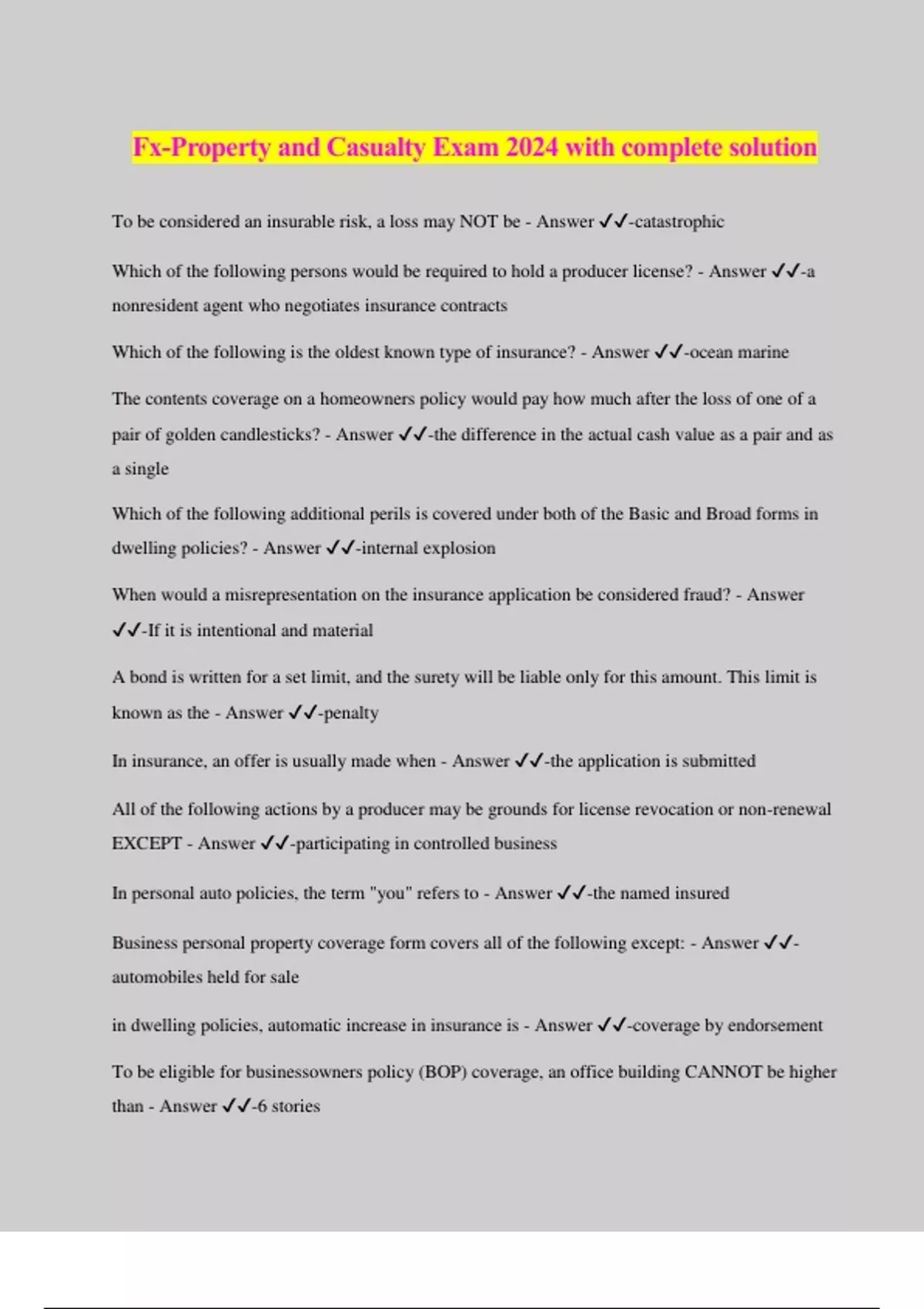 Fx-Property and Casualty Exam 2024 with complete solution To be considered an insurable risk, a loss may NOT be - Answer ️️ -catastrophic Which of the following persons would be required to hold a producer license? - Answer ️️ -a nonresident agent who negotiates insurance contracts Which of the following is the oldest known type of insurance? - Answer ️️ -ocean marine The contents coverage on a homeowners policy would pay how much after the loss of one of a pair of golden candlesticks? - Answer ️️ -the difference in the actual cash value as a pair and as a single Which of the following additional perils is covered under both of the Basic and Broad forms in dwelling policies? - Answer ️️ -internal explosion When would a misrepresentation on the insurance application be considered fraud? - Answer ️️ -If it is intentional and material A bond is written for a set limit, and the surety will be liable only for this amount. This limit is known as the - Answer ️️ -penalty In insurance, an offer is usually made when - Answer ️️ -the application is submitted All of the following actions by a producer may be grounds for license revocation or non-renewal EXCEPT - Answer ️️ -participating in controlled business In personal auto policies, the term "you" refers to - Answer ️️ -the named insured Business personal property coverage form covers all of the following except: - Answer ️️ - automobiles held for sale in dwelling policies, automatic increase in insurance is - Answer ️️ -coverage by endorsement To be eligible for businessowners policy (BOP) coverage, an office building CANNOT be higher than - Answer ️️ -6 stories Elaborate homes with replacement costs greater than ACV or market value are insured on the - Answer ️️ -HO-8 Form Which of the following dwelling coverage forms would pay replacement cost for the dwelling? - Answer ️️ -DP-2 and DP-3 Business personal property coverage insures property out in the open if it is - Answer ️️ - Within 100 feet of the described premises A runaway shopping cart injures a customer in a supermarket's parking lot. Coverage for this claim would be provided under - Answer ️️ -premises and operations Which of the following businesses would be eligible for a businessowners policy? - Answer ️️ - Hill & Morton Funeral Home The designation symbols used in commercial auto policies can be found in which policy section? - Answer ️️ -covered aut