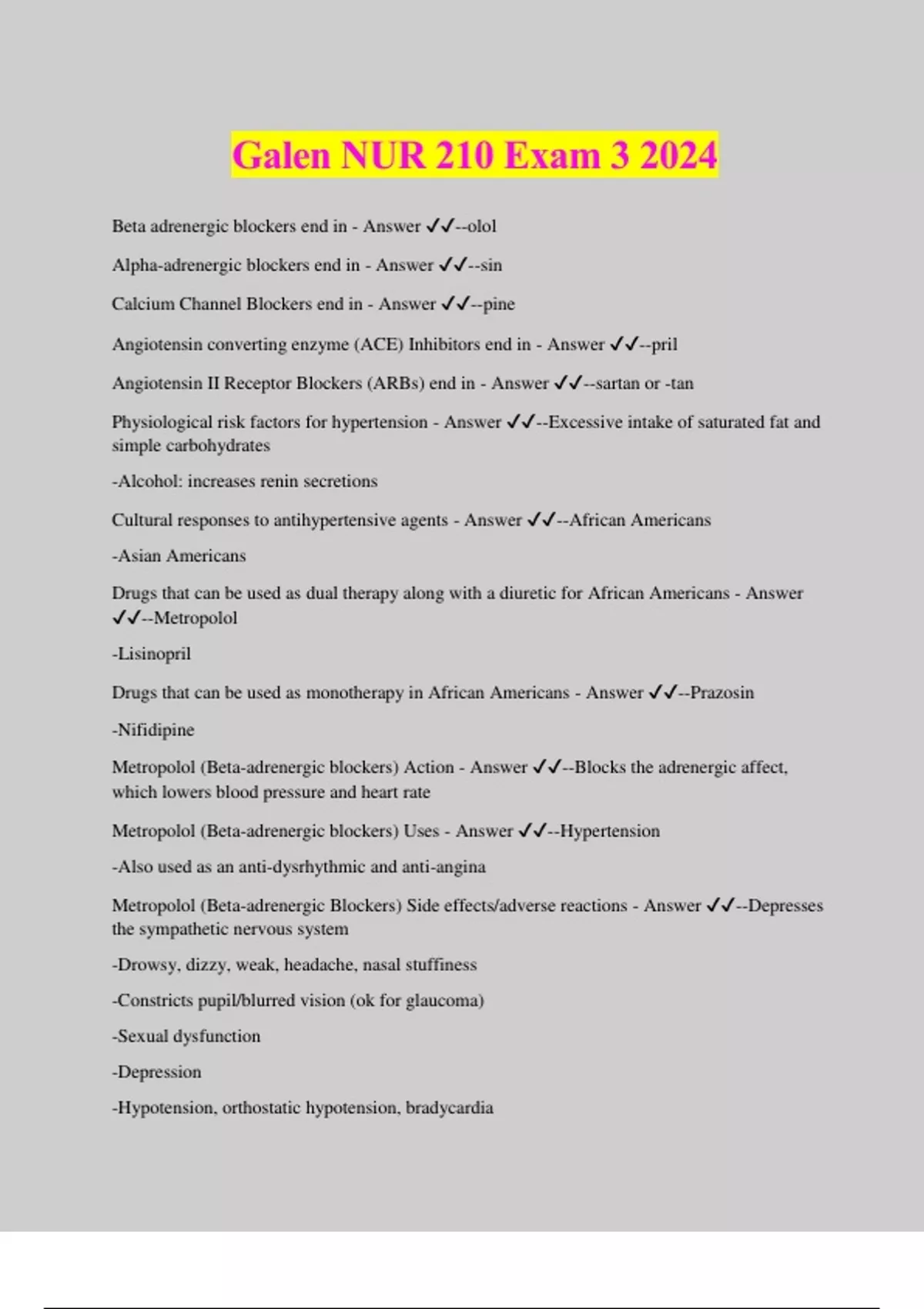 Galen NUR 210 Exam 3 2024 Beta adrenergic blockers end in - Answer ️️ --olol Alpha-adrenergic blockers end in - Answer ️️ --sin Calcium Channel Blockers end in - Answer ️️ --pine Angiotensin converting enzyme (ACE) Inhibitors end in - Answer ️️ --pril Angiotensin II Receptor Blockers (ARBs) end in - Answer ️️ --sartan or -tan Physiological risk factors for hypertension - Answer ️️ --Excessive intake of saturated fat and simple carbohydrates -Alcohol: increases renin secretions Cultural responses to antihypertensive agents - Answer ️️ --African Americans -Asian Americans Drugs that can be used as dual therapy along with a diuretic for African Americans - Answer ️️ --Metropolol -Lisinopril Drugs that can be used as monotherapy in African Americans - Answer ️️ --Prazosin -Nifidipine Metropolol (Beta-adrenergic blockers) Action - Answer ️️ --Blocks the adrenergic affect, which lowers blood pressure and heart rate Metropolol (Beta-adrenergic blockers) Uses - Answer ️️ --Hypertension -Also used as an anti-dysrhythmic and anti-angina Metropolol (Beta-adrenergic Blockers) Side effects/adverse reactions - Answer ️️ --Depresses the sympathetic nervous system -Drowsy, dizzy, weak, headache, nasal stuffiness -Constricts pupil/blurred vision (ok for glaucoma) -Sexual dysfunction -Depression -Hypotension, orthostatic hypotension, bradycardia -Photosensitivity -Hypoglycemia -Bronchospasm Metropolol (Beta-adrenergic blockers) Contraindications - Answer ️️ --Heart block -Hypotension -Acute heart failure -Bradycardia Metropolol (Beta-adrenergic blockers) Caution - Answer ️️ --Diabetes -Asthma -Liver, kidney or thyroid dysfunction Metropolol (Beta-adrenergic blockers) Interactions - Answer ️️ --Other drugs that lower heart rate or blood pressure -OTC cold medications -Alcohol -Anti-diabetic drugs -NSAIDS decrease effectiveness Prazosin (Alpha-adrenergic blockers) Action - Answer ️️ -Block the alpha-adrergic receptors, resulting in vasodilation and decreased blood pressure Prazosin (Alpha-adrenergic blockers) Uses - Answer ️️ --Hypertension -Heart failure -Benign prostatic hypertrophy Prazosin (Alpha-adrenergic blockers) Side effects/adverse reactions - Answer ️️ --Dizzy, drowsy -Dry mouth -headache -Abdominal pain -Urinary incontinence -Orthostatic hypotension, hypot