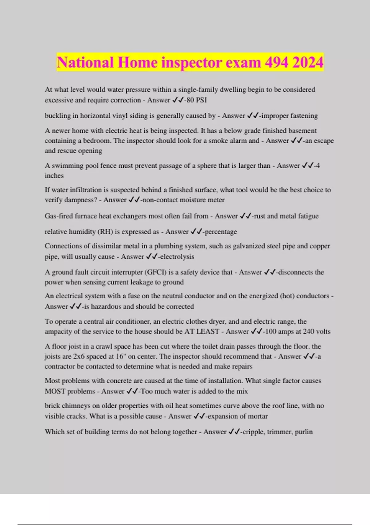 National Home inspector exam 494 2024 At what level would water pressure within a single-family dwelling begin to be considered excessive and require correction - Answer ️️ -80 PSI buckling in horizontal vinyl siding is generally caused by - Answer ️️ -improper fastening A newer home with electric heat is being inspected. It has a below grade finished basement containing a bedroom. The inspector should look for a smoke alarm and - Answer ️️ -an escape and rescue opening A swimming pool fence must prevent passage of a sphere that is larger than - Answer ️️ -4 inches If water infiltration is suspected behind a finished surface, what tool would be the best choice to verify dampness? - Answer ️️ -non-contact moisture meter Gas-fired furnace heat exchangers most often fail from - Answer ️️ -rust and metal fatigue relative humidity (RH) is expressed as - Answer ️️ -percentage Connections of dissimilar metal in a plumbing system, such as galvanized steel pipe and copper pipe, will usually cause - Answer ️️ -electrolysis A ground fault circuit interrupter (GFCI) is a safety device that - Answer ️️ -disconnects the power when sensing current leakage to ground