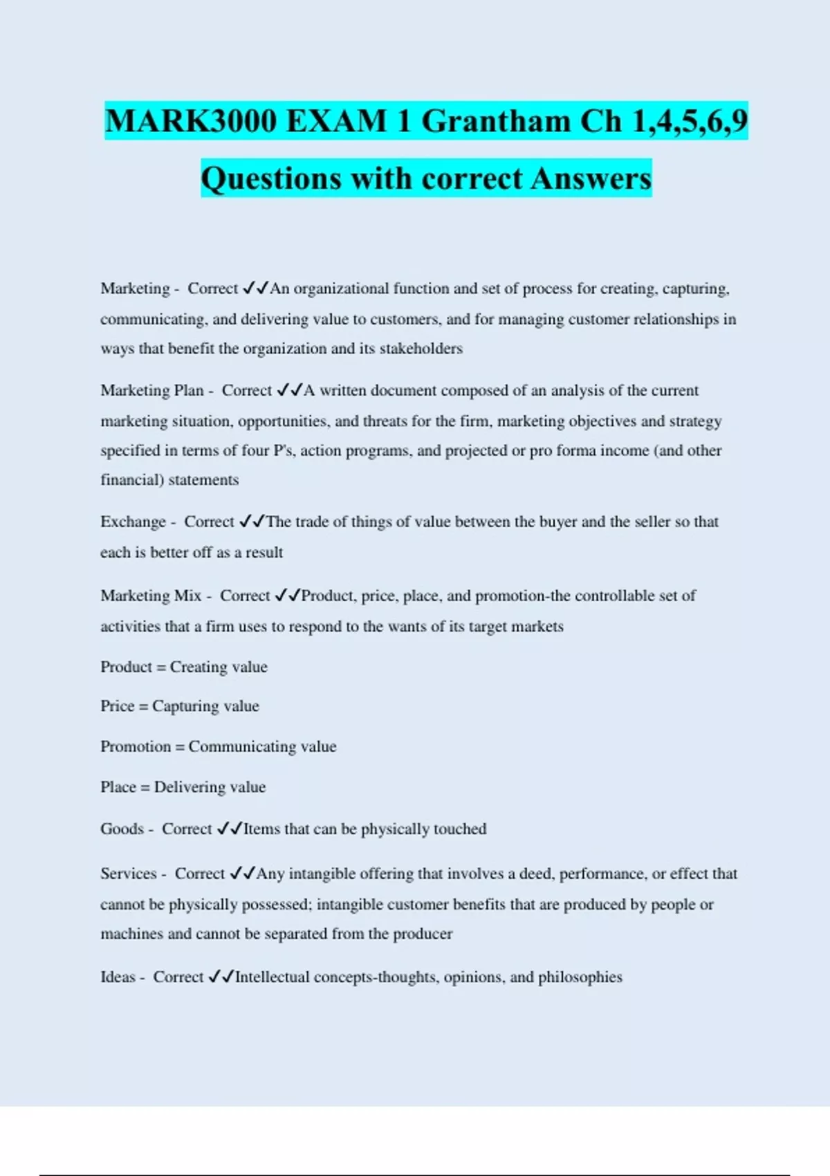MARK3000 EXAM 1 Grantham Ch 1,4,5,6,9 Questions with correct Answers
