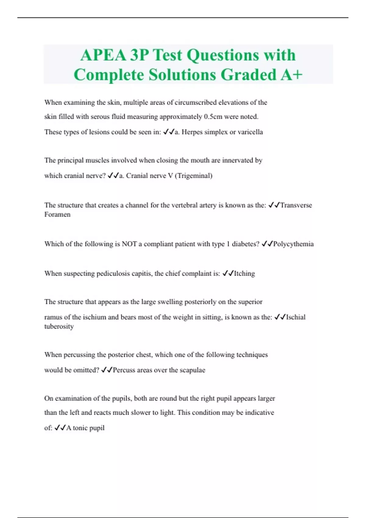 APEA 3P Test Questions with Complete Solutions Graded A+ When examining the skin, multiple areas of circumscribed elevations of the skin filled with serous fluid measuring approximately 0.5cm were noted. These types of lesions could be seen in: a. Herpes simplex or varicella The principal muscles involved when closing the mouth are innervated by which cranial nerve? a. Cranial nerve V (Trigeminal) The structure that creates a channel for the vertebral artery is known as the: Transverse Foramen Which of the following is NOT a compliant patient with type 1 diabetes? Polycythemia When suspecting pediculosis capitis, the chief complaint is: Itching The structure that appears as the large swelling posteriorly on the superior ramus of the ischium and bears most of the weight in sitting, is known as the: Ischial tuberosity When percussing the posterior chest, which one of the following techniques would be omitted? Percuss areas over the scapulae On examination of the pupils, both are round but the right pupil appears larger than the left and reacts much slower to light. This condition may be indicative of: A tonic pupil