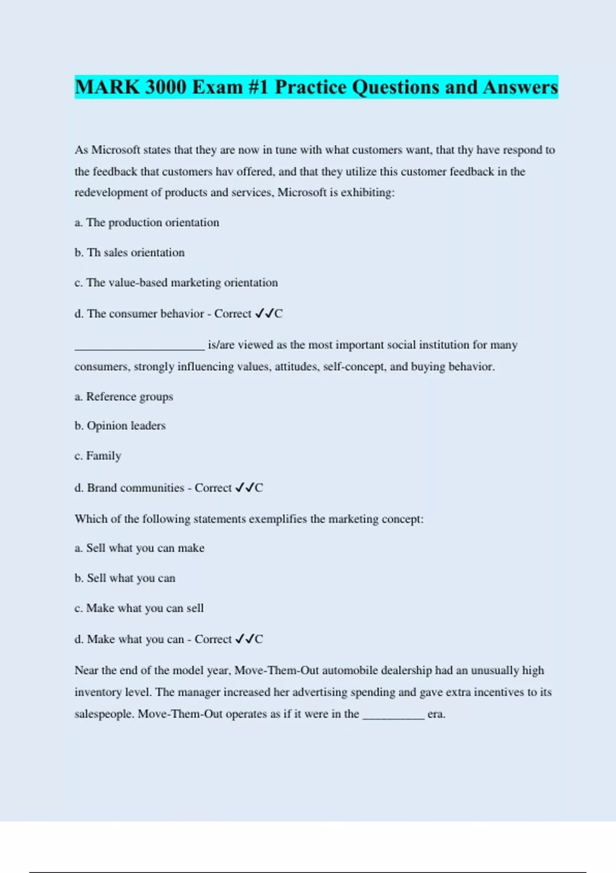 As Microsoft states that they are now in tune with what customers want, that thy have respond to the feedback that customers hav offered, and that they utilize this customer feedback in the redevelopment of products and services, Microsoft is exhibiting: a. The production orientation b. Th sales orientation c. The value-based marketing orientation d. The consumer behavior - Correct ️️ C _____________________ is/are viewed as the most important social institution for many consumers, strongly influencing values, attitudes, self-concept, and buying behavior. a. Reference groups b. Opinion leaders
