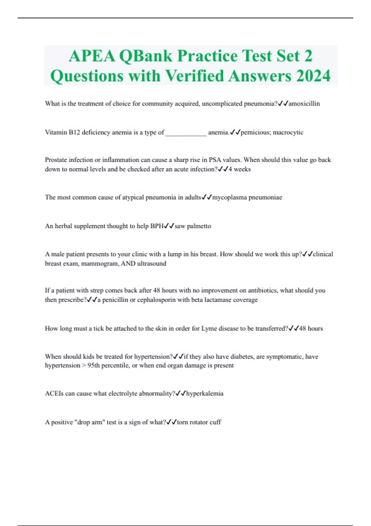 APEA QBank Practice Test Set 2 Questions with Verified Answers 2024 What is the treatment of choice for community acquired, uncomplicated pneumonia?amoxicillin Vitamin B12 deficiency anemia is a type of ____________ anemia.pernicious; macrocytic Prostate infection or inflammation can cause a sharp rise in PSA values. When should this value go back down to normal levels and be checked after an acute infection?4 weeks The most common cause of atypical pneumonia in adultsmycoplasma pneumoniae An herbal supplement thought to help BPHsaw palmetto A male patient presents to your clinic with a lump in his breast. How should we work this up?clinical breast exam, mammogram, AND ultrasound If a patient with strep comes back after 48 hours with no improvement on antibiotics, what should you then prescribe?a penicillin or cephalosporin with beta lactamase coverage How long must a tick be attached to the skin in order for Lyme disease to be transferred?48 hours When should kids be treated for hypertension?if they also have diabetes, are symptomatic, have hypertension > 95th percentile, or when end organ damage is present ACEIs can cause what electrolyte abnormality?hyperkalemia A positive "drop arm" test is a sign of what?torn rotator cuff