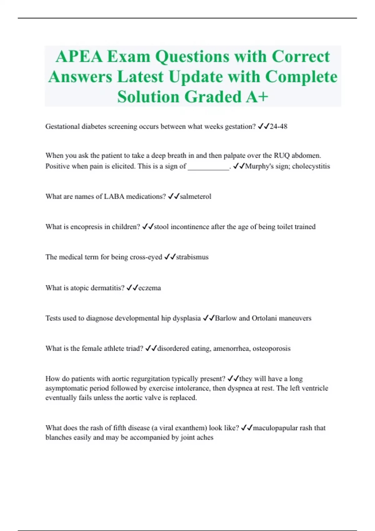APEA Exam Questions with Correct Answers Latest Update with Complete Solution Graded A+ Gestational diabetes screening occurs between what weeks gestation? 24-48 When you ask the patient to take a deep breath in and then palpate over the RUQ abdomen. Positive when pain is elicited. This is a sign of ___________. Murphy's sign; cholecystitis What are names of LABA medications? salmeterol What is encopresis in children? stool incontinence after the age of being toilet trained The medical term for being cross-eyed strabismus What is atopic dermatitis? eczema Tests used to diagnose developmental hip dysplasia Barlow and Ortolani maneuvers What is the female athlete triad? disordered eating, amenorrhea, osteoporosis How do patients with aortic regurgitation typically present? they will have a long asymptomatic period followed by exercise intolerance, then dyspnea at rest. The left ventricle eventually fails unless the aortic valve is replaced. What does the rash of fifth disease (a viral exanthem) look like? maculopapular rash that blanches easily and may be accompanied by joint aches